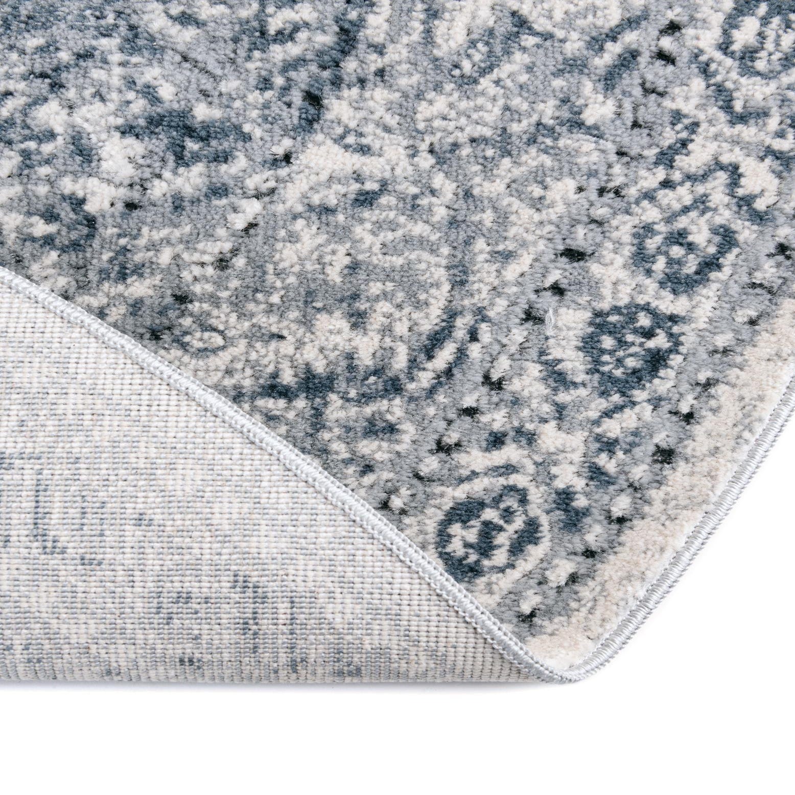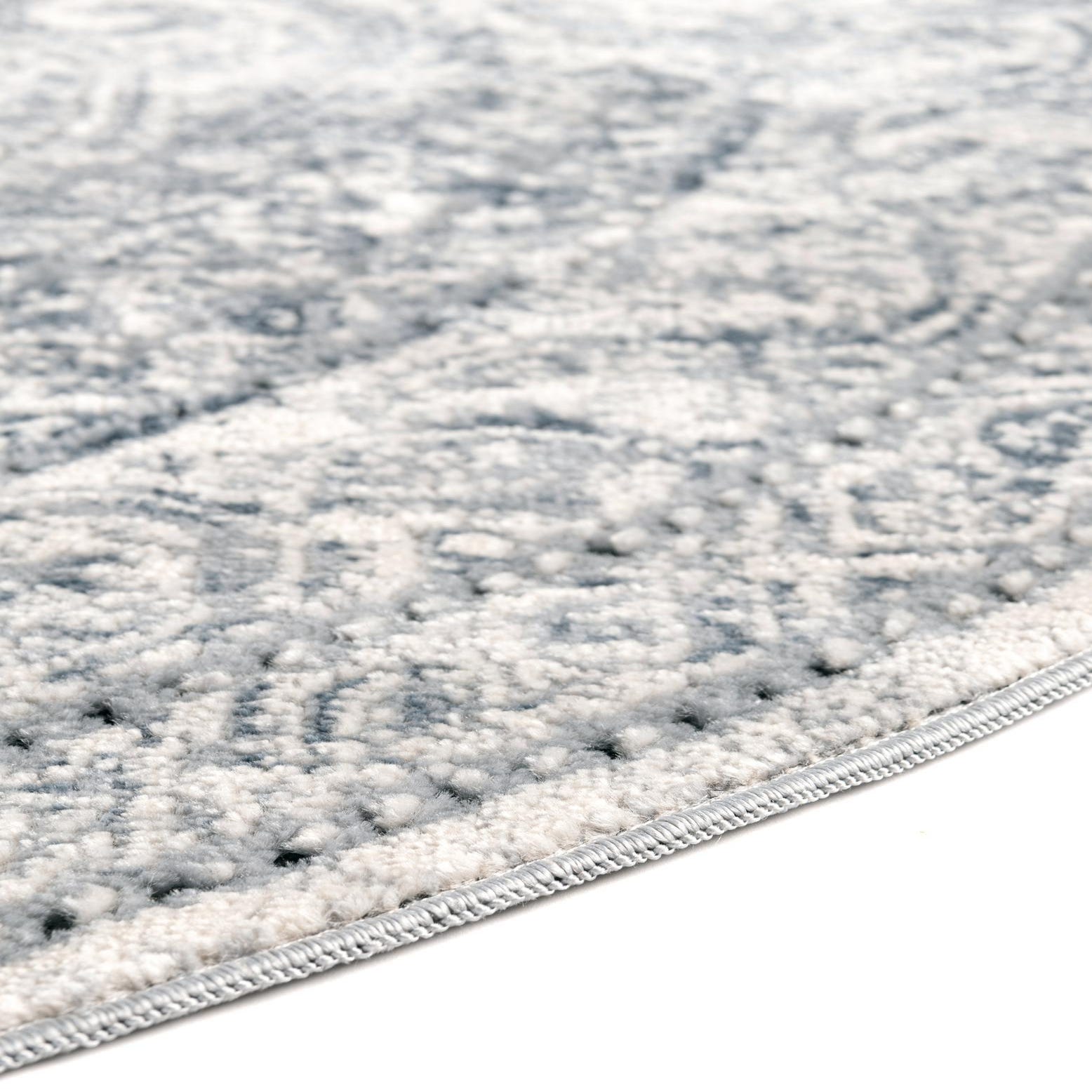 A classic medallion pattern unfolds across a round dark blue field, where scrolling vines, filigree and floral motifs are worked in gray and ivory. The design has a gently distressed, vintage-inspired finish that softens the contrast between colors and adds visual depth. Machine-made construction blends 85% polypropylene with 15% chenille, giving the surface a low, even pile with chenille accents that feel pleasantly soft and slightly velvety underfoot.