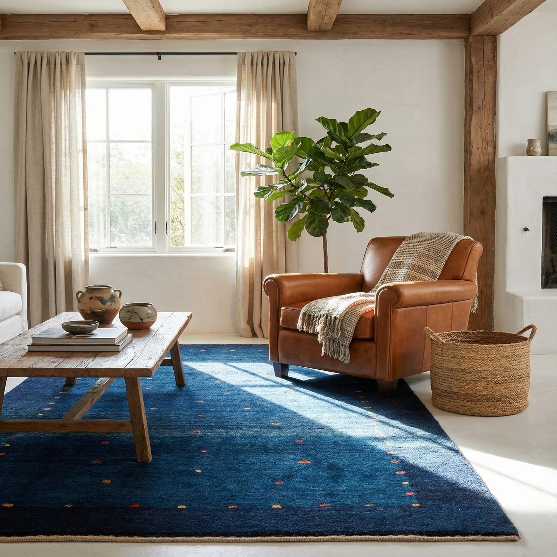 A 4x6 rectangular Gabbeh wool rug in varying shades of blue with a modern dotted pattern, ideal for an entryway or living room.
