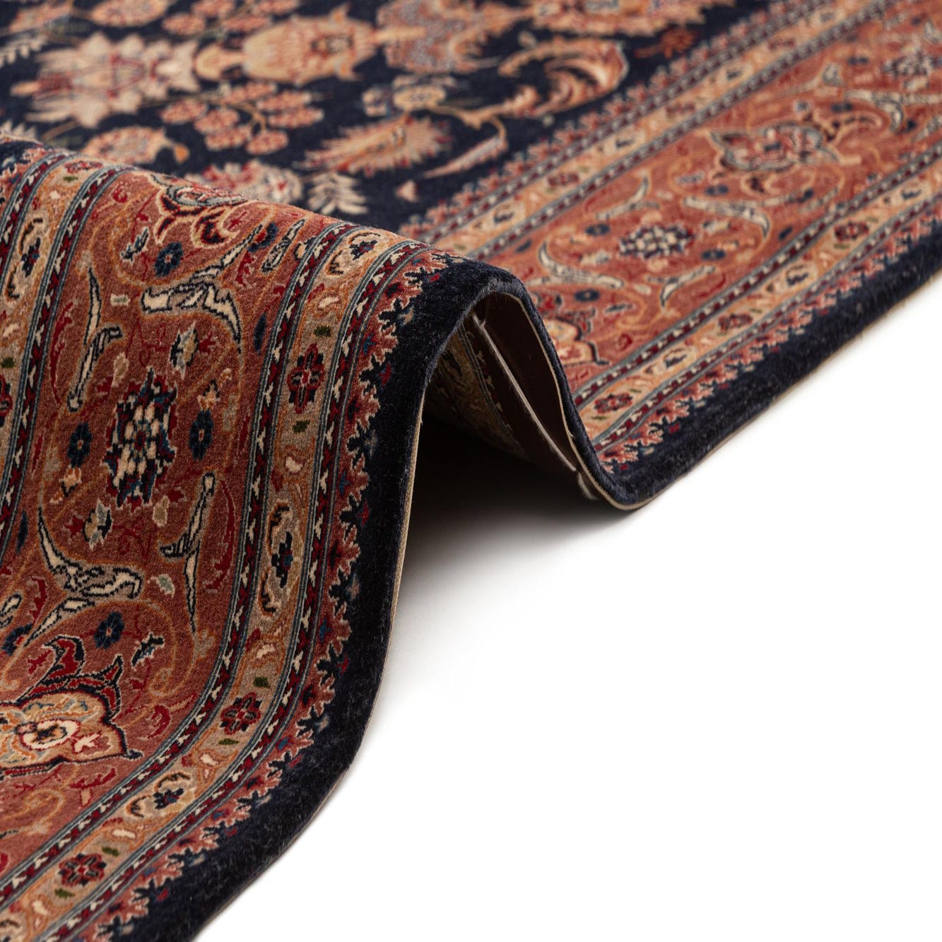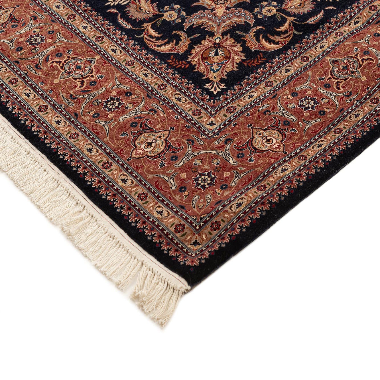 Hand-knotted from sheep virgin wool, this rug offers a dense, tactile pile with a subtle, natural luster and clearly defined knotwork. A deep dark blue field is filled with an allover floral vine pattern in warm rust, soft gold and ivory accents, while a wide rust-toned border with repeating motifs frames the central design. The ivory fringe provides a clean finish and contrast against the rich colors.