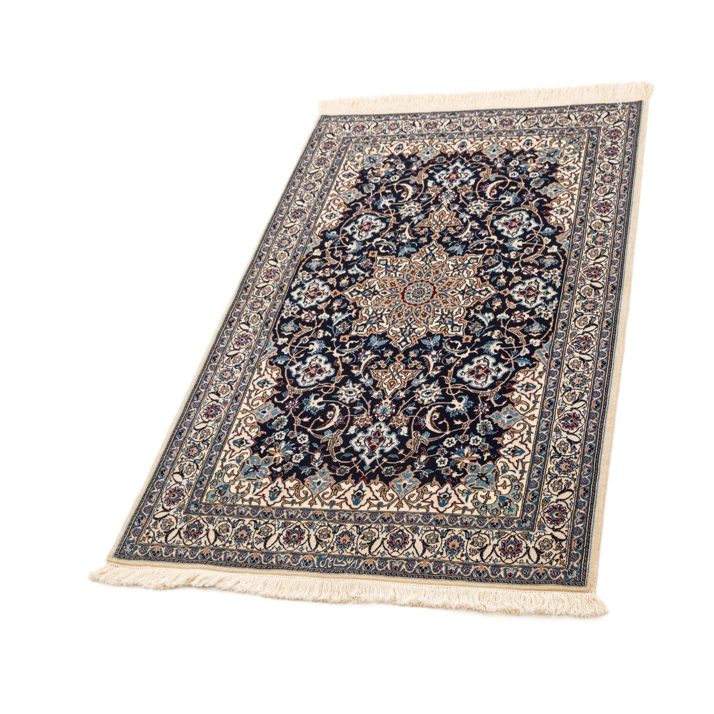 A 4x6 rectangular handmade wool and silk rug featuring a rich navy blue field with intricate traditional patterns in light blue, cream, and hints of red, framed by a detailed border and cream fringe.