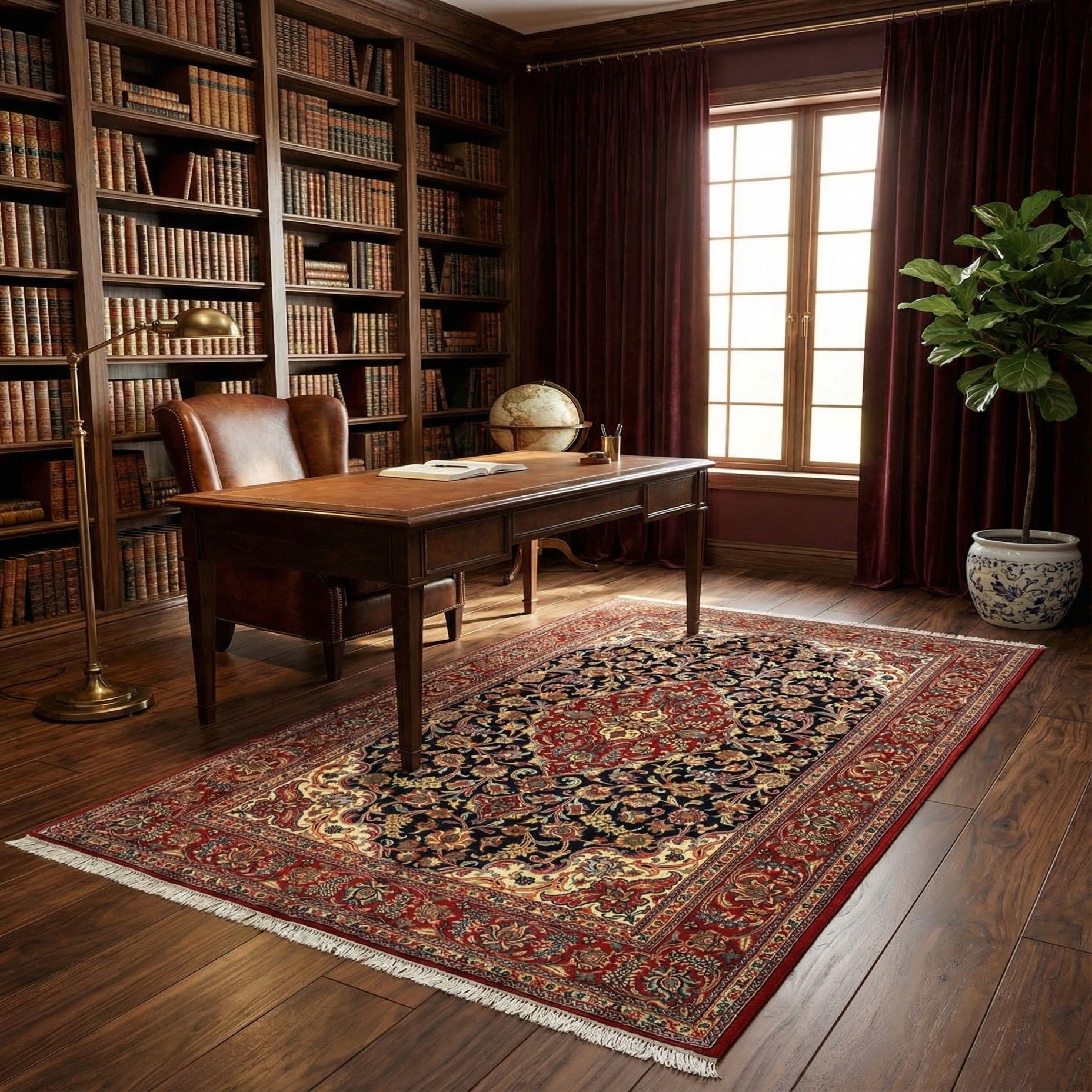 This piece would integrate seamlessly into interiors that favor traditional aesthetics, such as those with antique furnishings, rich wooden accents, and a preference for timeless elegance. Concurrently, it could serve as a striking contrast piece in more contemporary spaces, bringing warmth and a sense of history to minimalist or modern decors. The Ghom rug's versatile hues and classic design make it an adaptable and sophisticated choice for living rooms, dining areas, or offices seeking a touch of traditional flair.