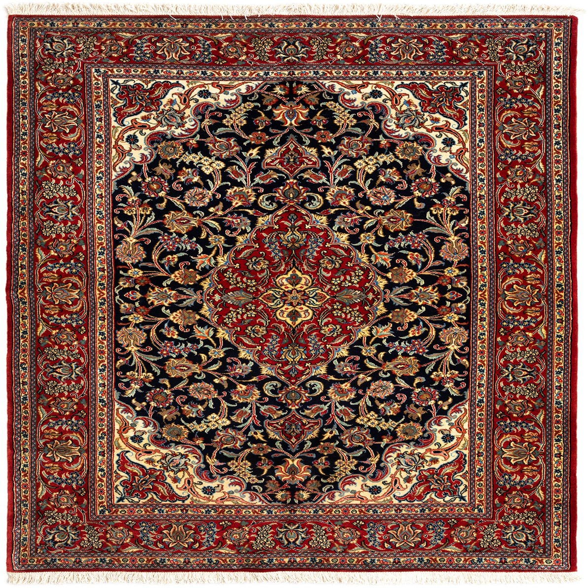 A 4x6 rectangular Persian rug with a deep blue field, intricate floral patterns, and a rich red border.