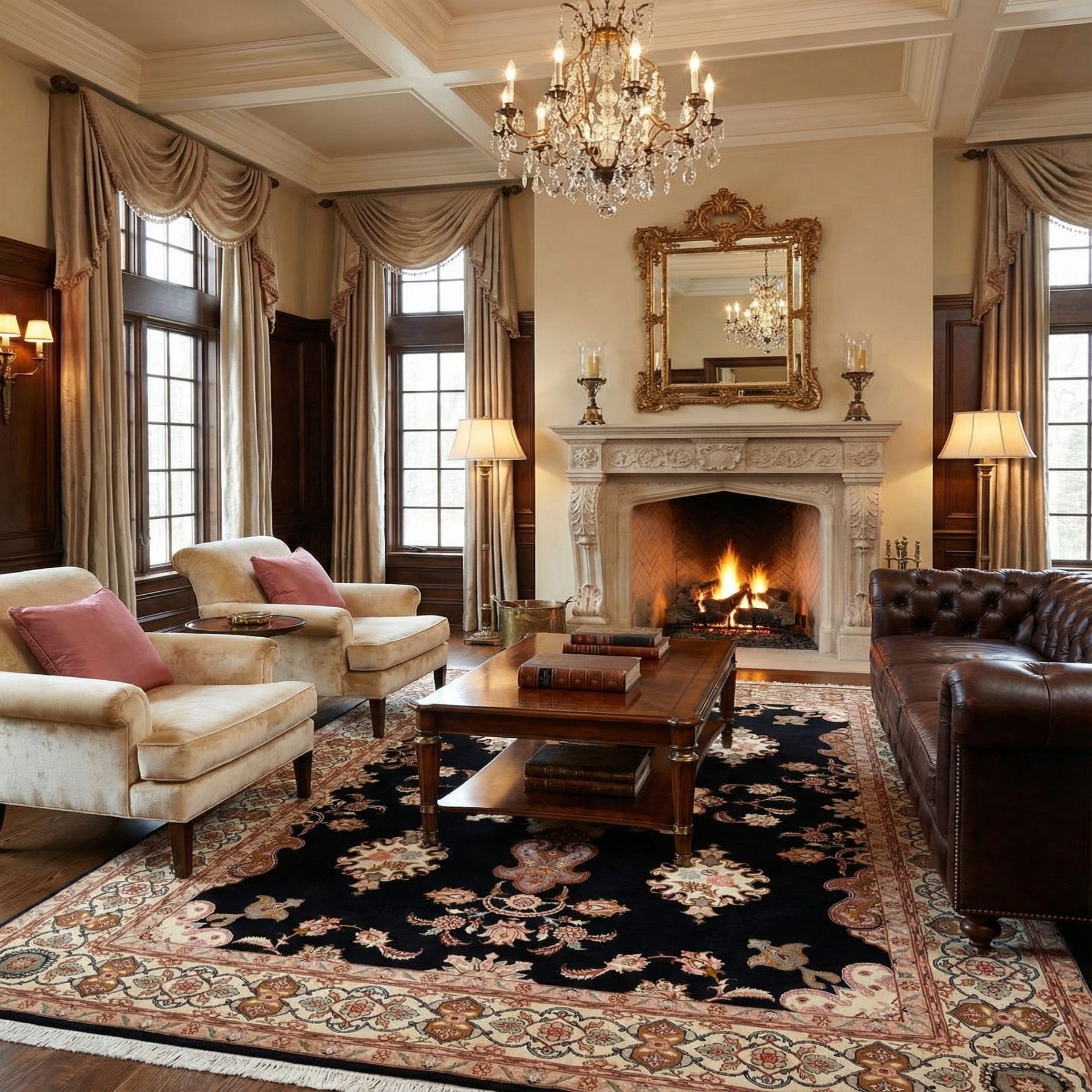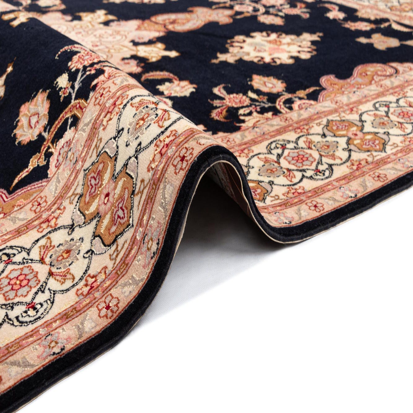 A 4x6 rectangular Persian rug with a deep blue field and intricate floral motifs in cream, gold, and light pink, with a detailed border.