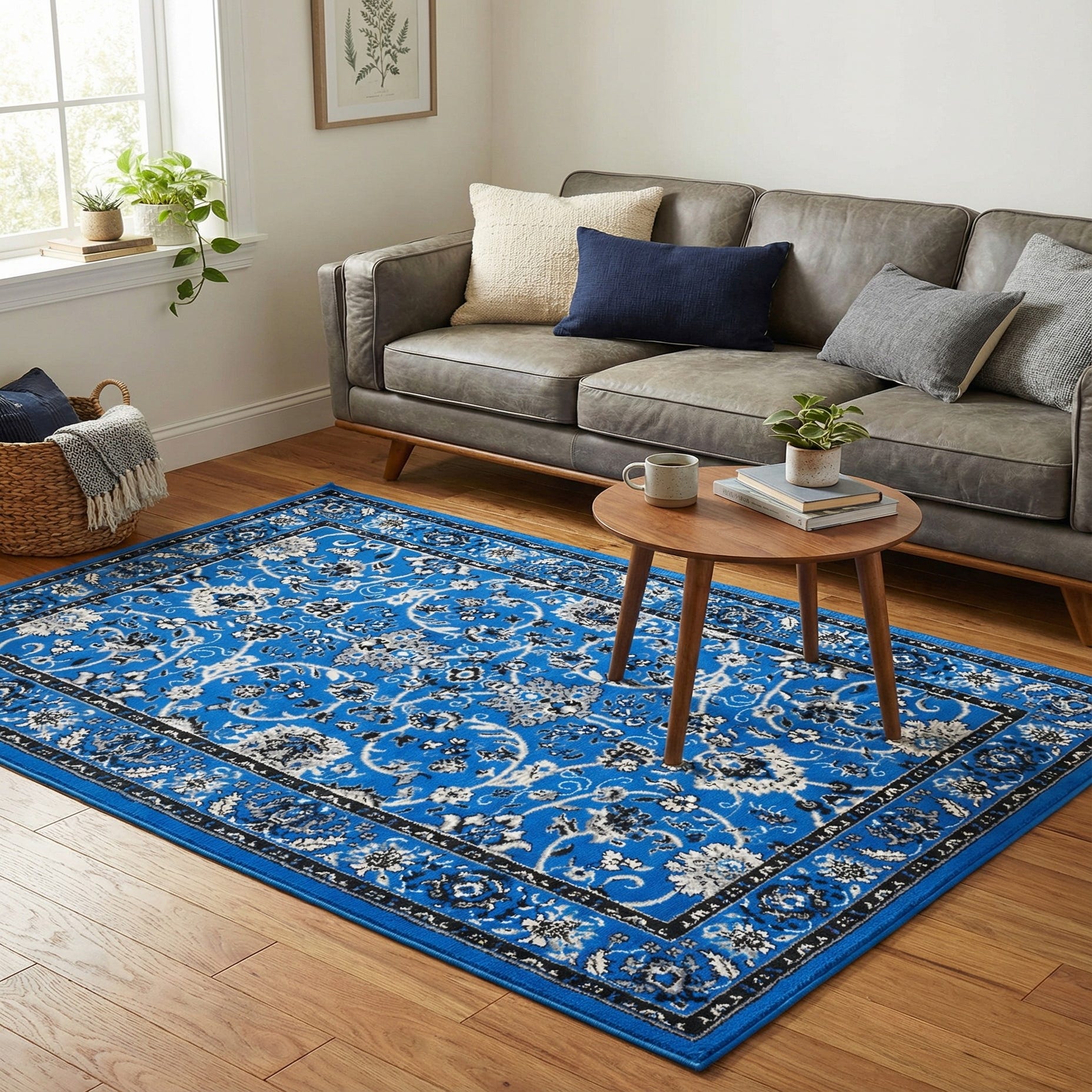 A 4x6 rectangular Yasmin rug in vibrant blue with a traditional floral and oriental pattern in white, grey, and black.