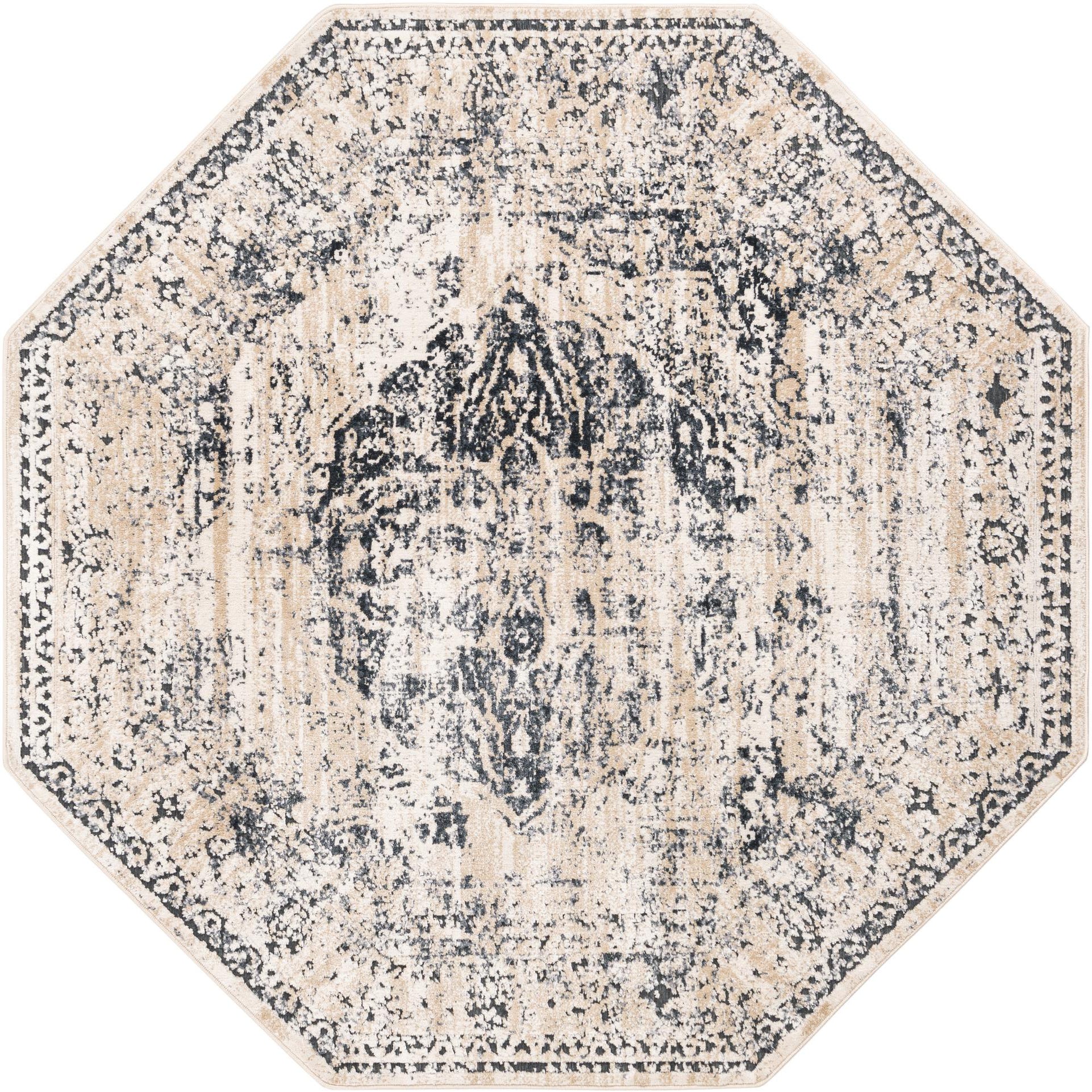 An octagonal rug with a distressed medallion motif that blends traditional ornament with a lived-in, updated finish. A dark blue ground anchors the design while layered beige and cream patterns form the medallion and border, creating soft contrast and visual movement across the surface. Machine-made from 85% polypropylene and 15% chenille, the weave has a low-to-medium profile where polypropylene keeps the pattern crisp and chenille delivers a soft, velvety hand and subtle sheen when you run your fingers across it.