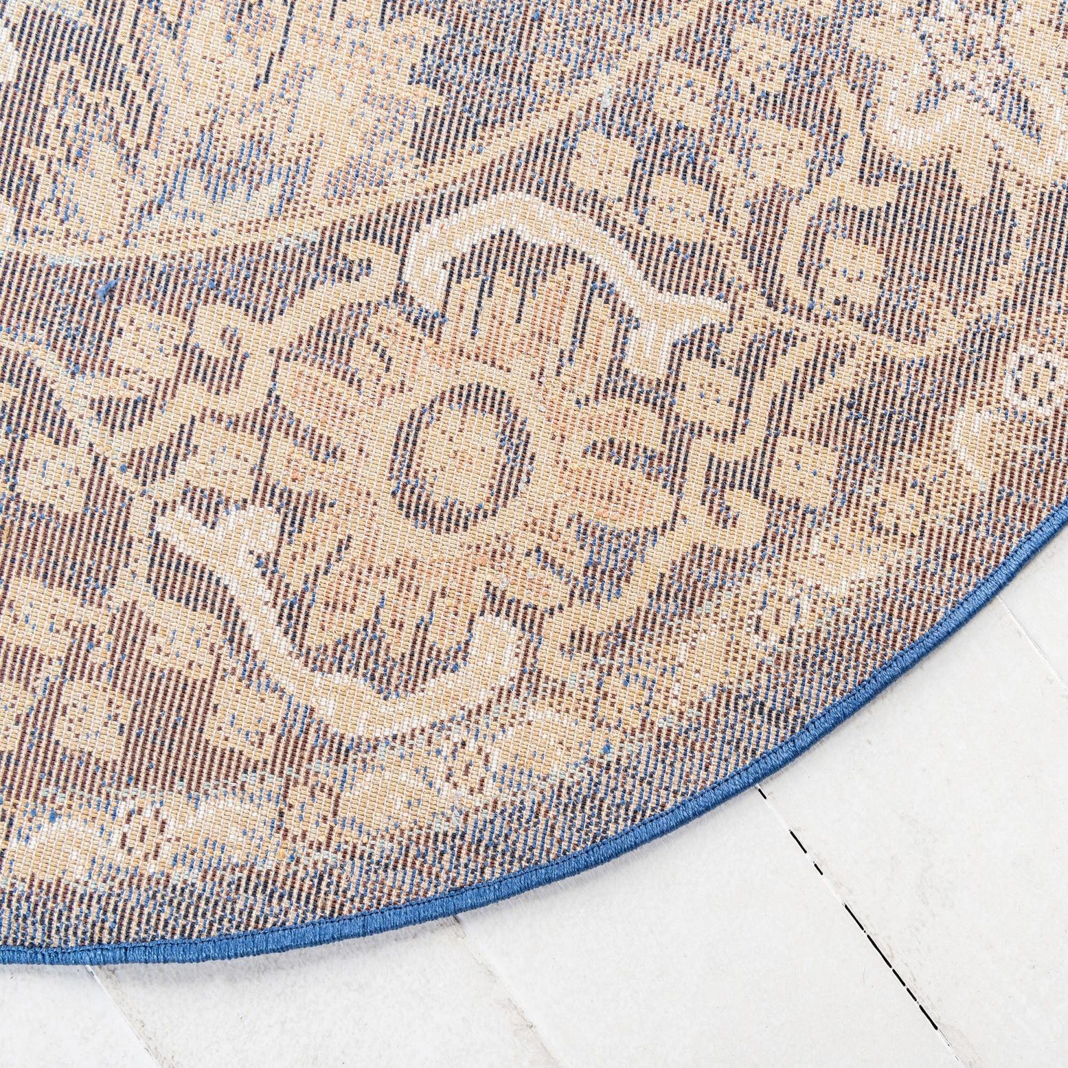 Classic, Persian-inspired motifs form a balanced medallion at the center of this round rug, surrounded by a detailed floral and vine border. The dark blue field provides a deep, even backdrop for the pattern, while accents in light brown, brown, ivory and touches of blue bring warmth and contrast to the design. The ornamental florals and scrolling elements are clearly defined, giving the piece a traditional, timeless look that works with both classic and transitional decor.
