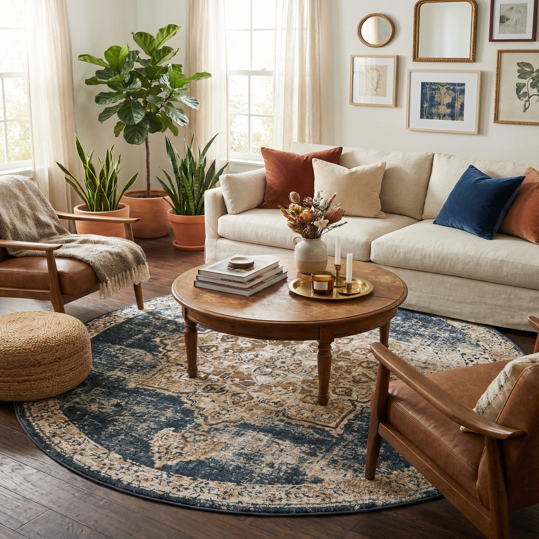 This piece works well layered beneath a small round dining table or centered under a coffee table to define a conversation area. It pairs naturally with warm wood tones, leather seating and brass or matte-black accents, and suits transitional, traditional, or modern farmhouse interiors where a lived-in, refined look is desired. Use it in an entryway or bedroom seating nook to introduce color and pattern without overpowering the room.