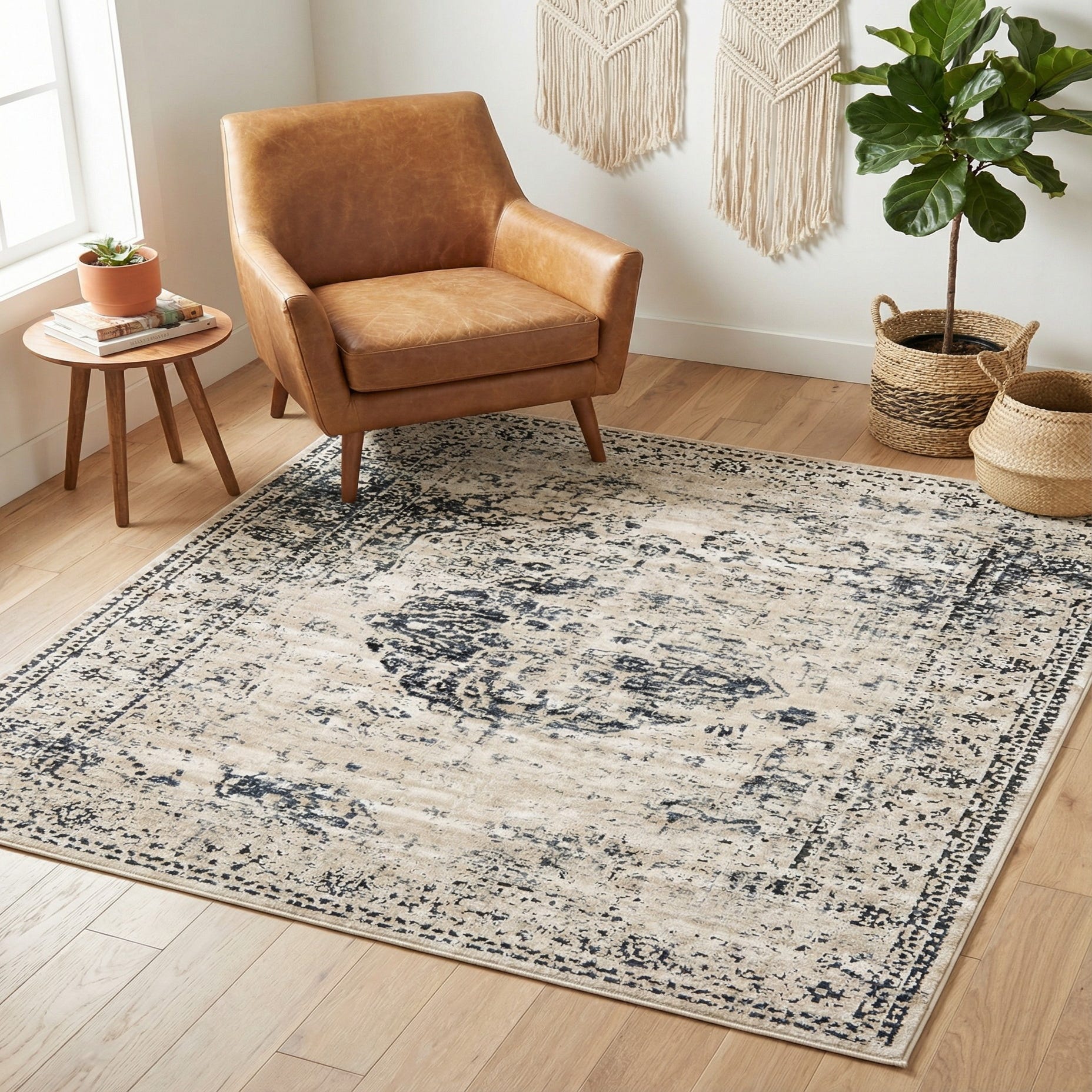 Primary color is Dark Blue. Colors in this rug include: Dark Blue, Beige, Cream.