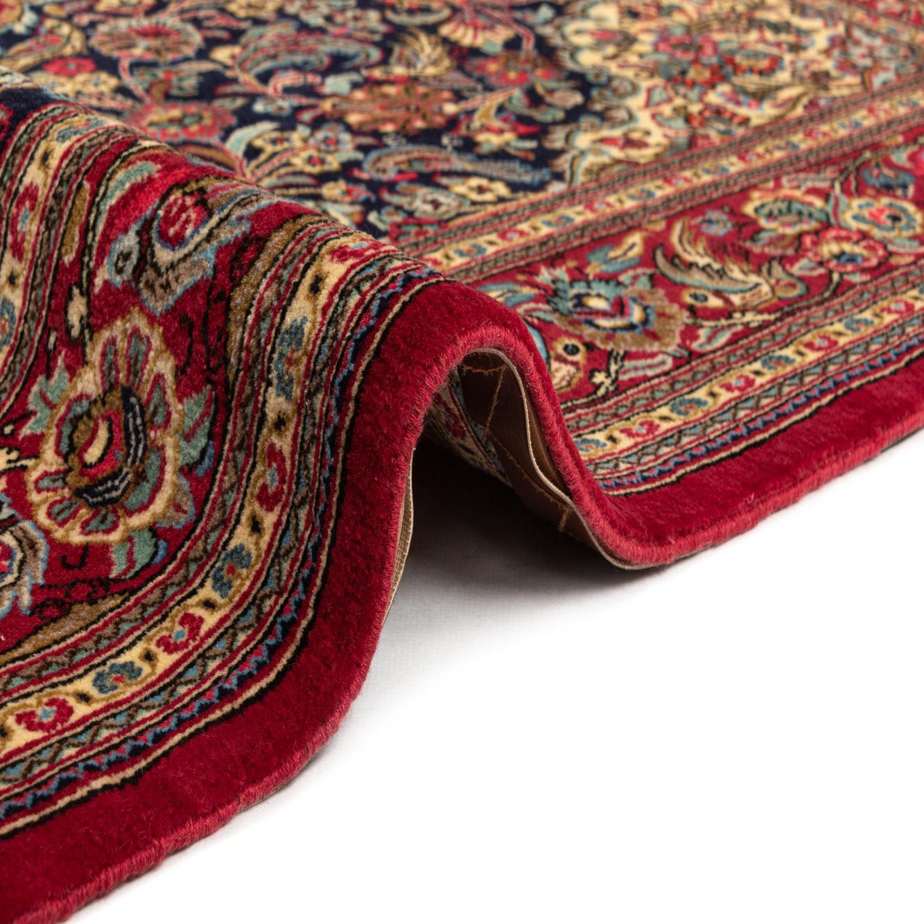 A 5x7 rectangular Persian rug with a deep blue field, intricate floral patterns, and a prominent red medallion, framed by a rich red border.
