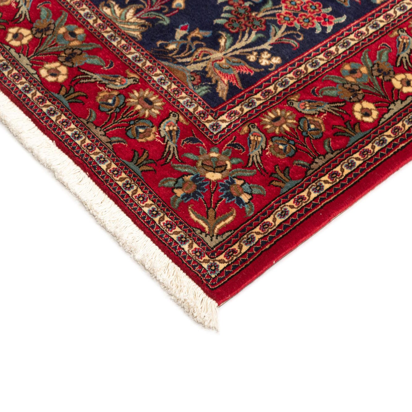 A 5x7 rectangular blue Persian rug with an intricate floral and bird pattern, framed by a rich red border.