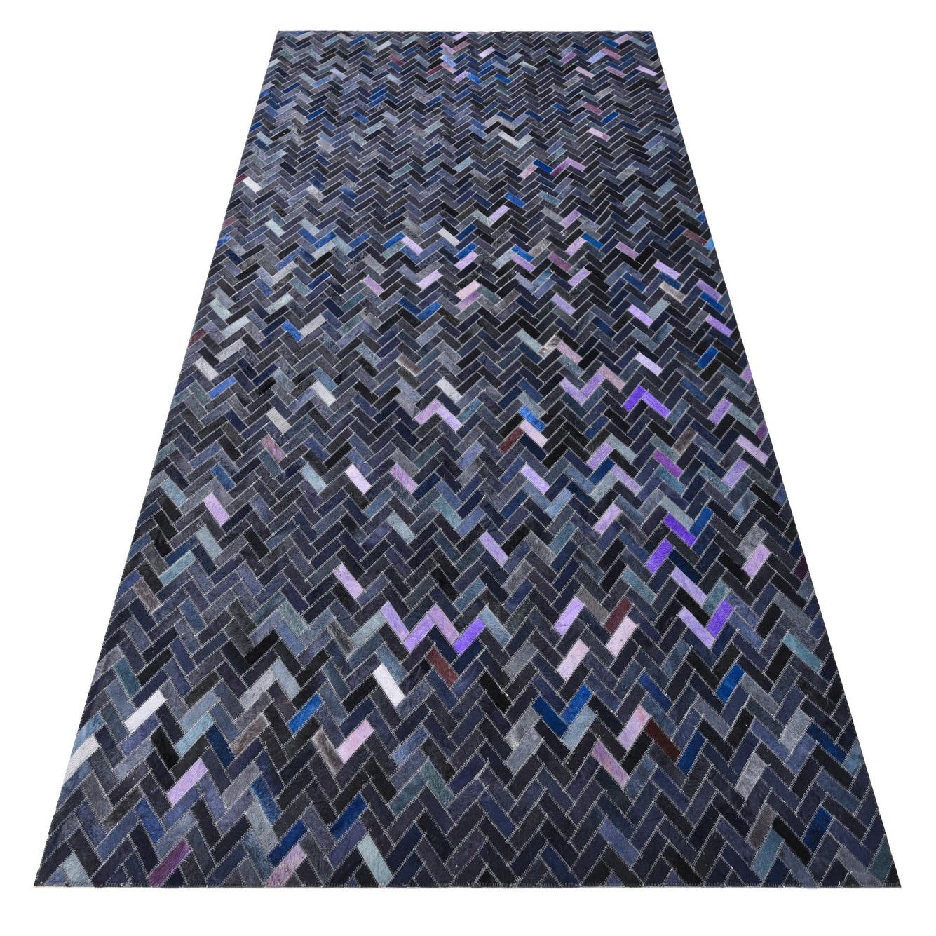 A 5x8 rectangular Cowhide rug featuring a modern herringbone pattern in various shades of blue and purple.