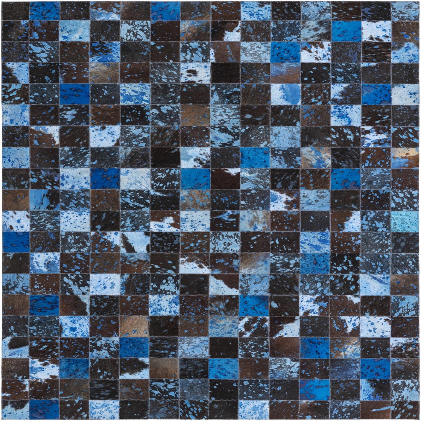 Handmade of cowhide and leather, this rug arranges small square patches into a disciplined checkerboard where dark blue serves as the dominant ground. Each patch displays its own mottled or spotted markings in tones of dark blue, light blue and black, creating a lively yet controlled pattern. The hair-on-hide surface has a soft nap you can feel, with visible stitched seams that give the piece structure and tactile variation from square to square.
