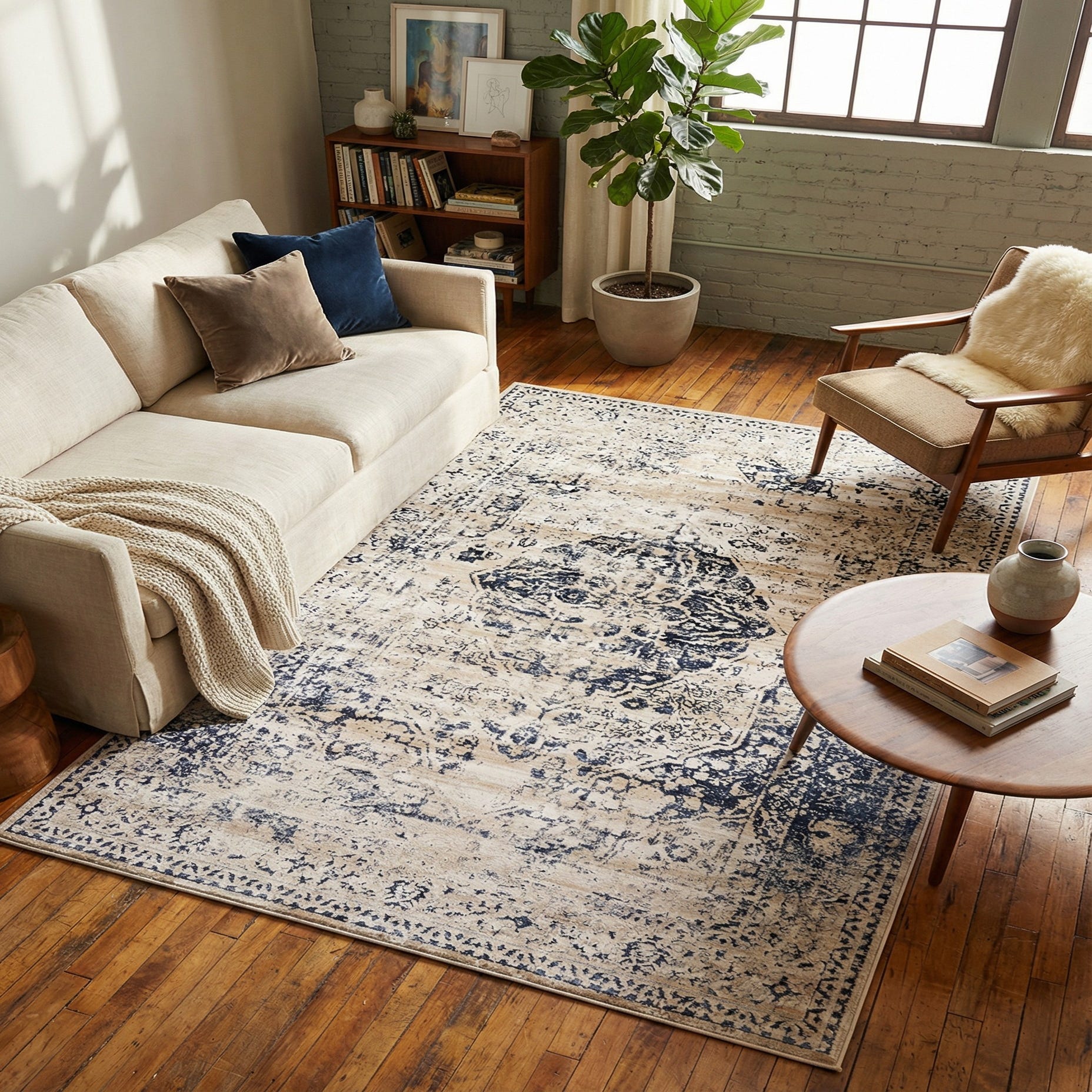 A classic medallion layout takes on a relaxed, lived-in look with this machine-made rug. Dark blue forms the background while cream and beige ornament the central medallion and surrounding motifs, giving the pattern a softly distressed, vintage-inspired appearance. The design balances traditional floral and border details with an intentionally faded finish, offering the visual interest of an antique piece in a more casual, contemporary execution.