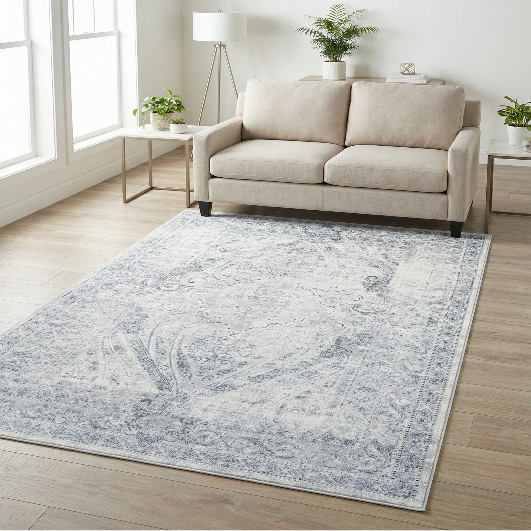A softly aged medallion pattern gives this rug a classic, timeworn look with a modern, muted palette. An ornate central medallion and scrolling border are rendered in layers of gray and ivory against a dark blue background, creating depth without heavy contrast. The distressed finish allows the pattern to read as both traditional and relaxed, making it a versatile anchor for a range of interiors.