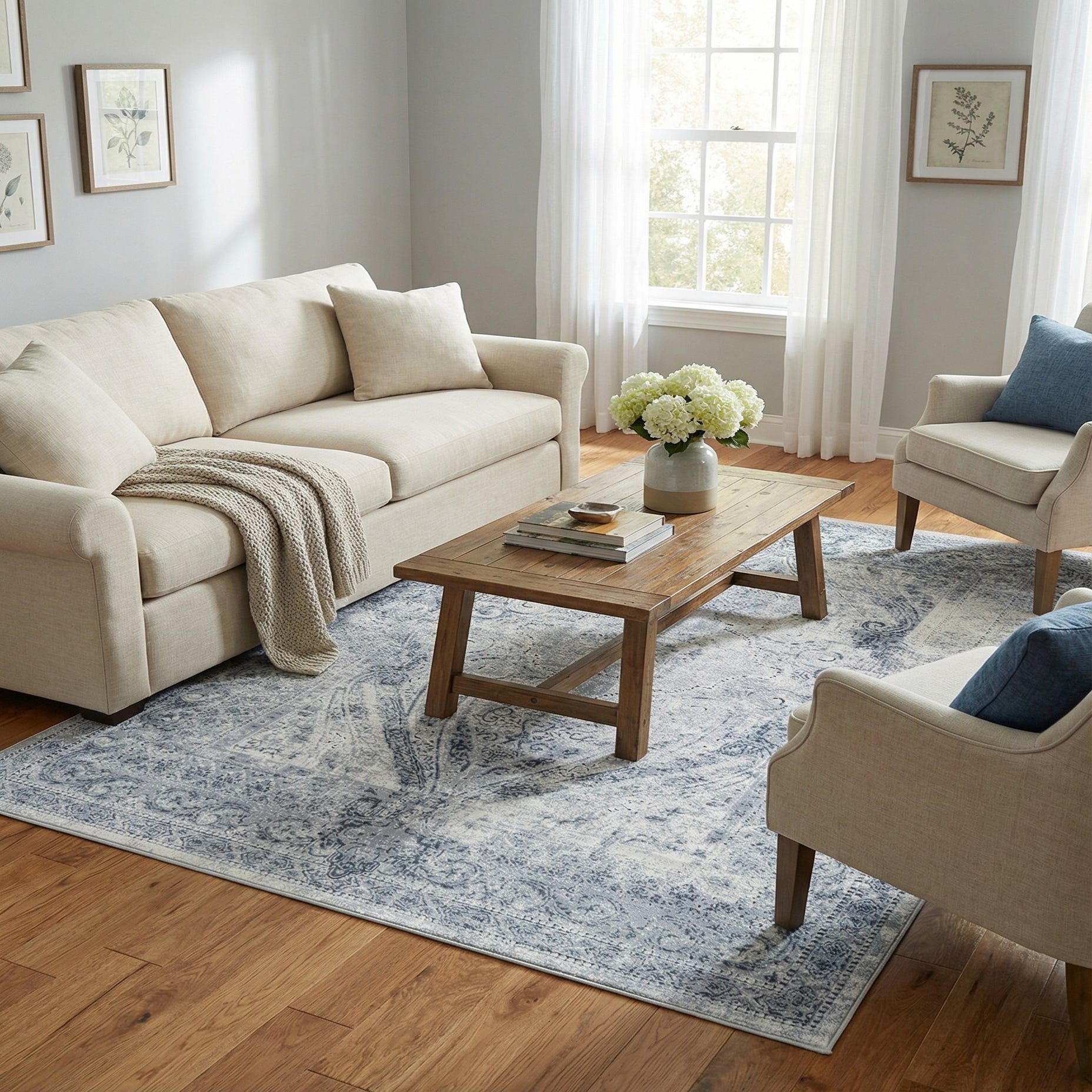 Machine-made from 85% polypropylene and 15% chenille, the construction balances durability with a touch of softness—the chenille threads add a gentle, low-profile plushness while the polypropylene provides dimensional stability. Place it beneath a living room seating group to ground sofas and a coffee table, layer it under a dining table to introduce subtle pattern without overpowering, or use it in a bedroom to add calm, cool tones. It pairs well with neutral upholstery, warm wood tones, and matte metal accents in contemporary traditional, coastal, or transitional decorating schemes.