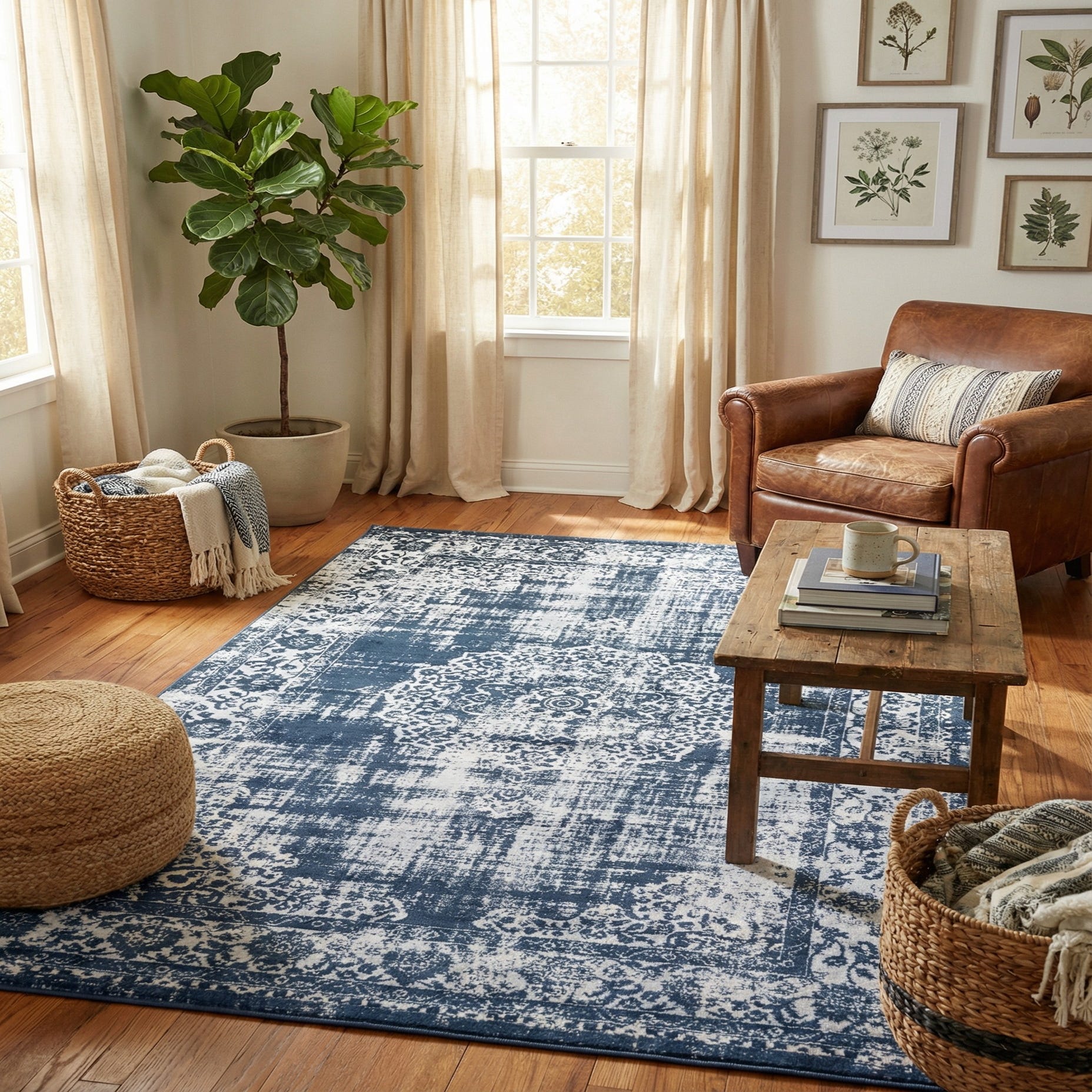 The Estate collection showcases a refined 5x8 rug with a sophisticated dark blue and ivory color palette. The dark blue background is artfully distressed, giving it a vintage appeal, while the ivory accents create a time-worn yet elegant pattern. Machine woven from a durable blend of 85% polypropylene and 15% polyester, this piece offers both a soft texture and resilience against daily wear.