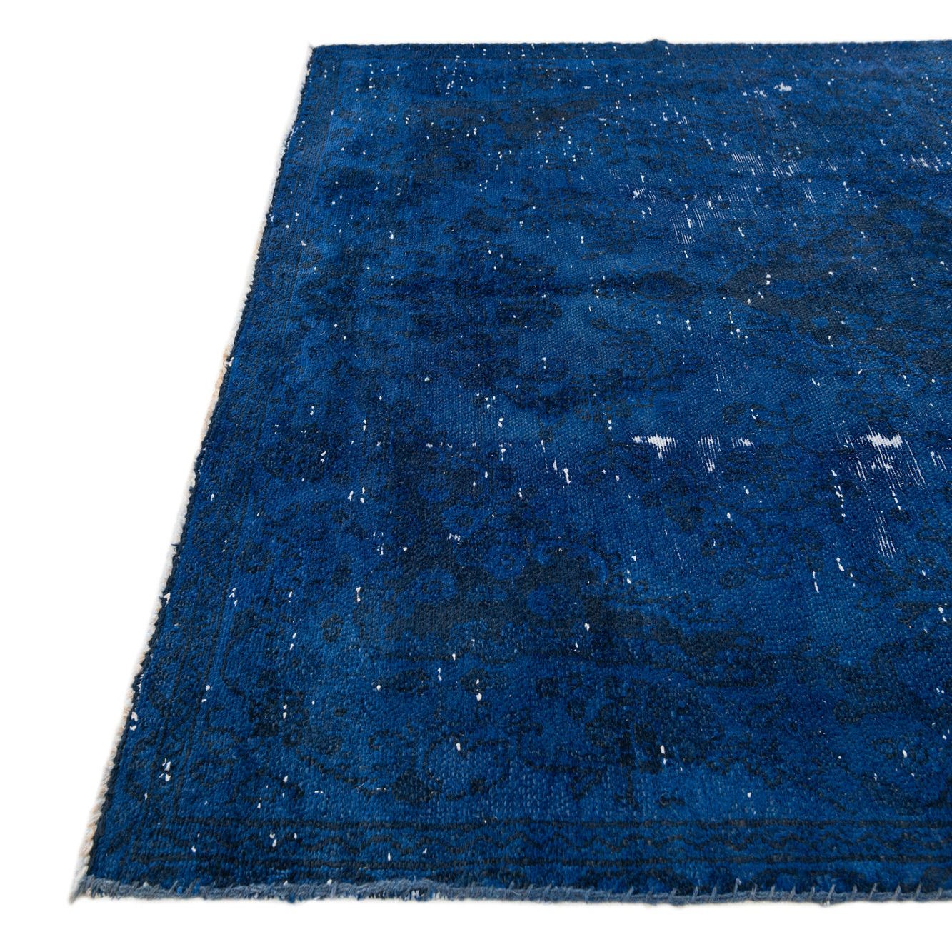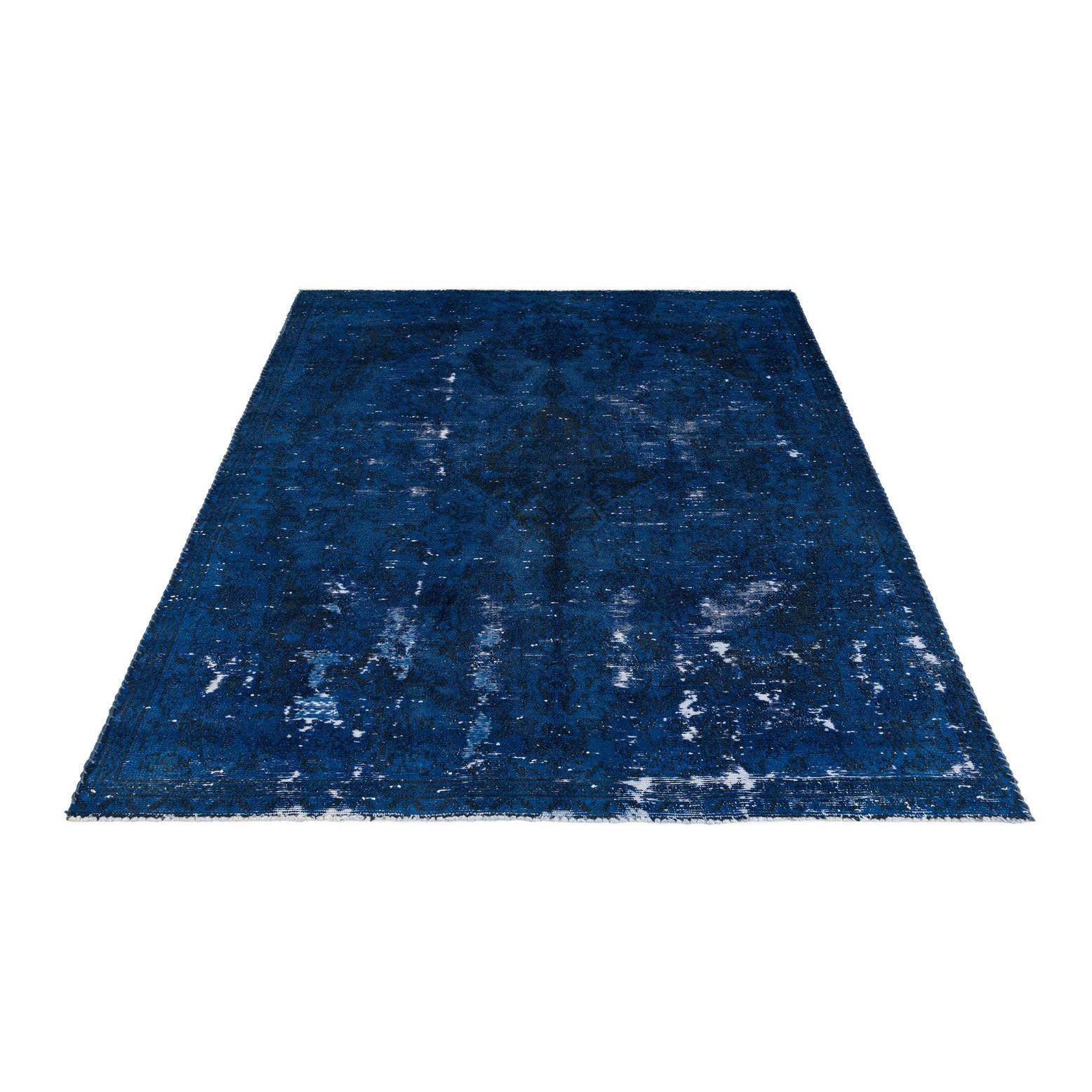 A 5x8 rectangular blue wool area rug with a distressed Persian medallion pattern, suitable for a living room.