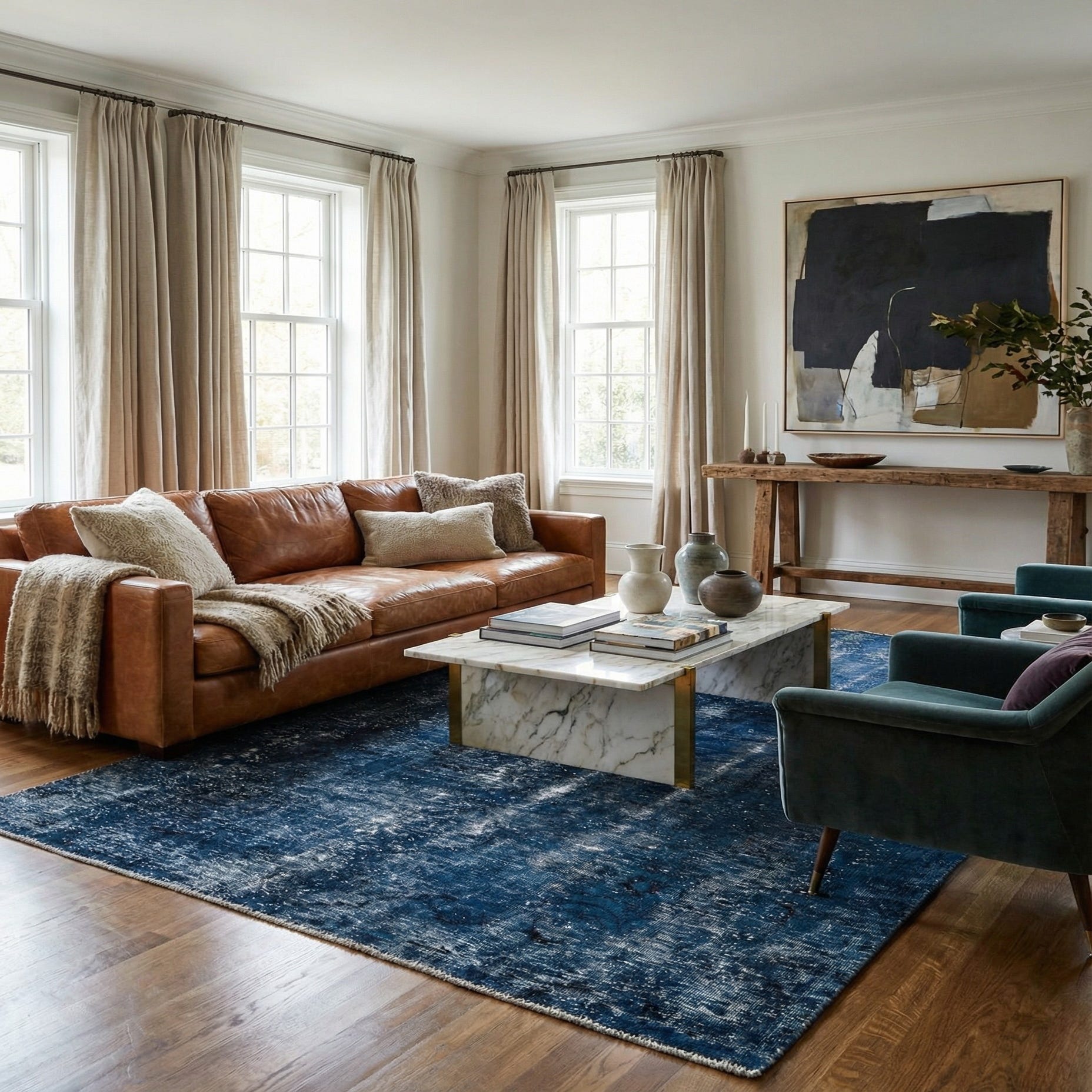 A 5x8 rectangular blue wool rug with a distressed vintage Persian medallion pattern, suitable for a living room.