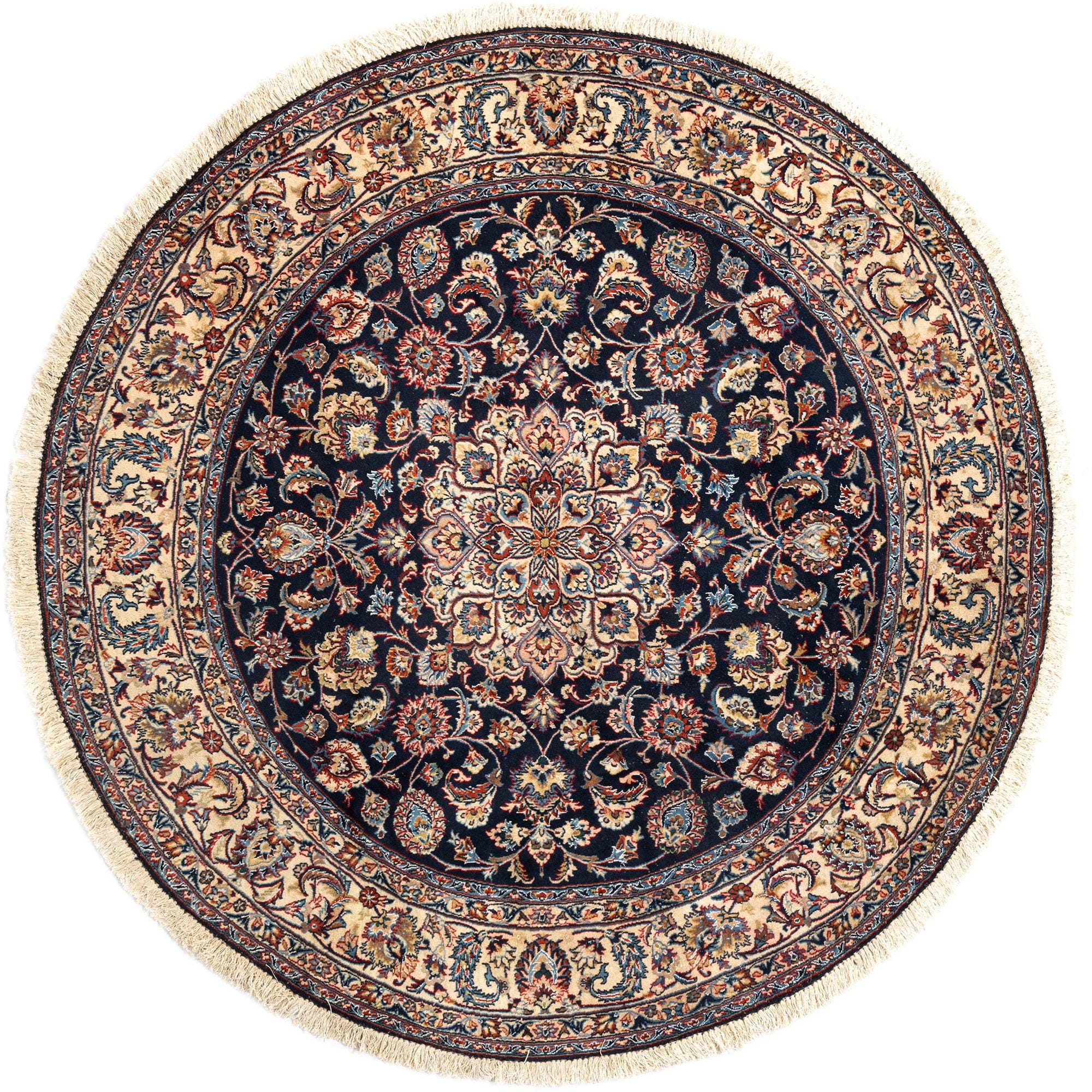 This Nain Collection rug is a handcrafted piece, blending wool and silk materials to create a 6-foot round rug that is not only durable but also has a touch of subtle sheen. The rug showcases a dark blue background, complemented by an assortment of colors including dark blue, cream, red, blue, beige, and brown, resulting in a rich and complex visual palette.