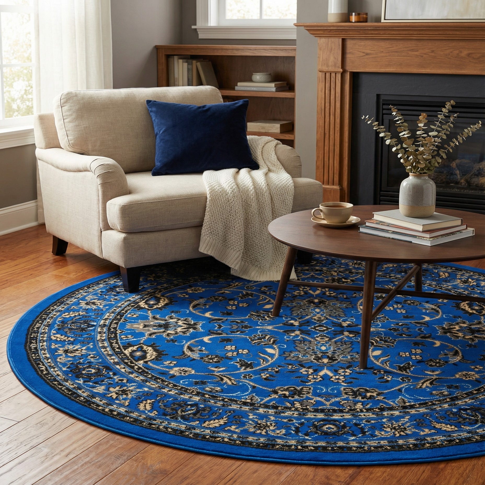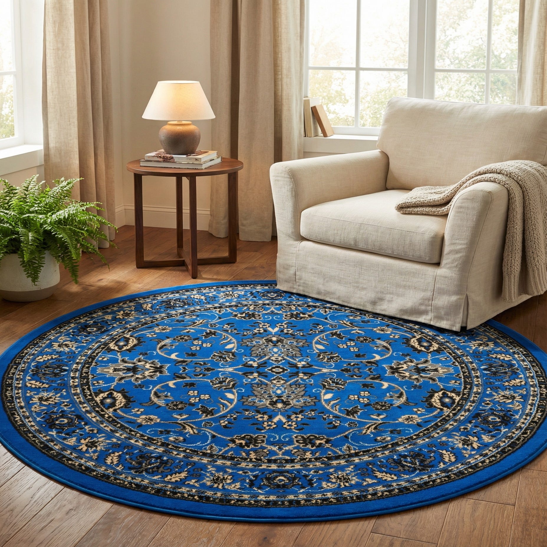 Primary color is Dark Blue. Colors in this rug include: Dark Blue, Black, Cream, Gray.