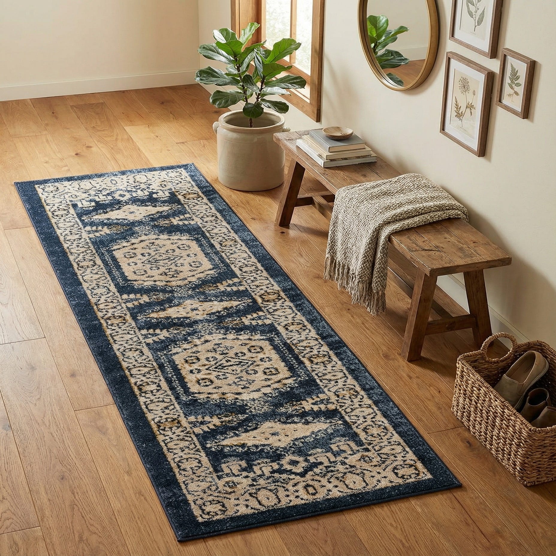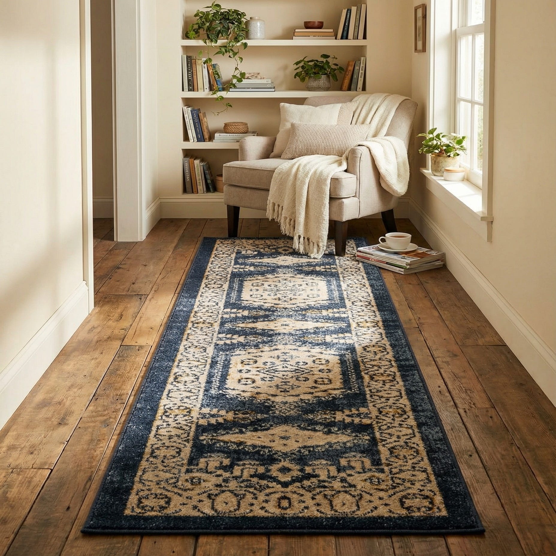 Use this runner to ground a narrow entry, hallway, or kitchen gallery where the deep blue anchor and warm gold accents complement wood floors or painted cabinetry. It works well with transitional to traditional interiors—pair with brass or aged-metal hardware and neutral upholstery for a cohesive look—or layer it in a coastal or modern farmhouse scheme where navy and ivory provide a strong base color palette.