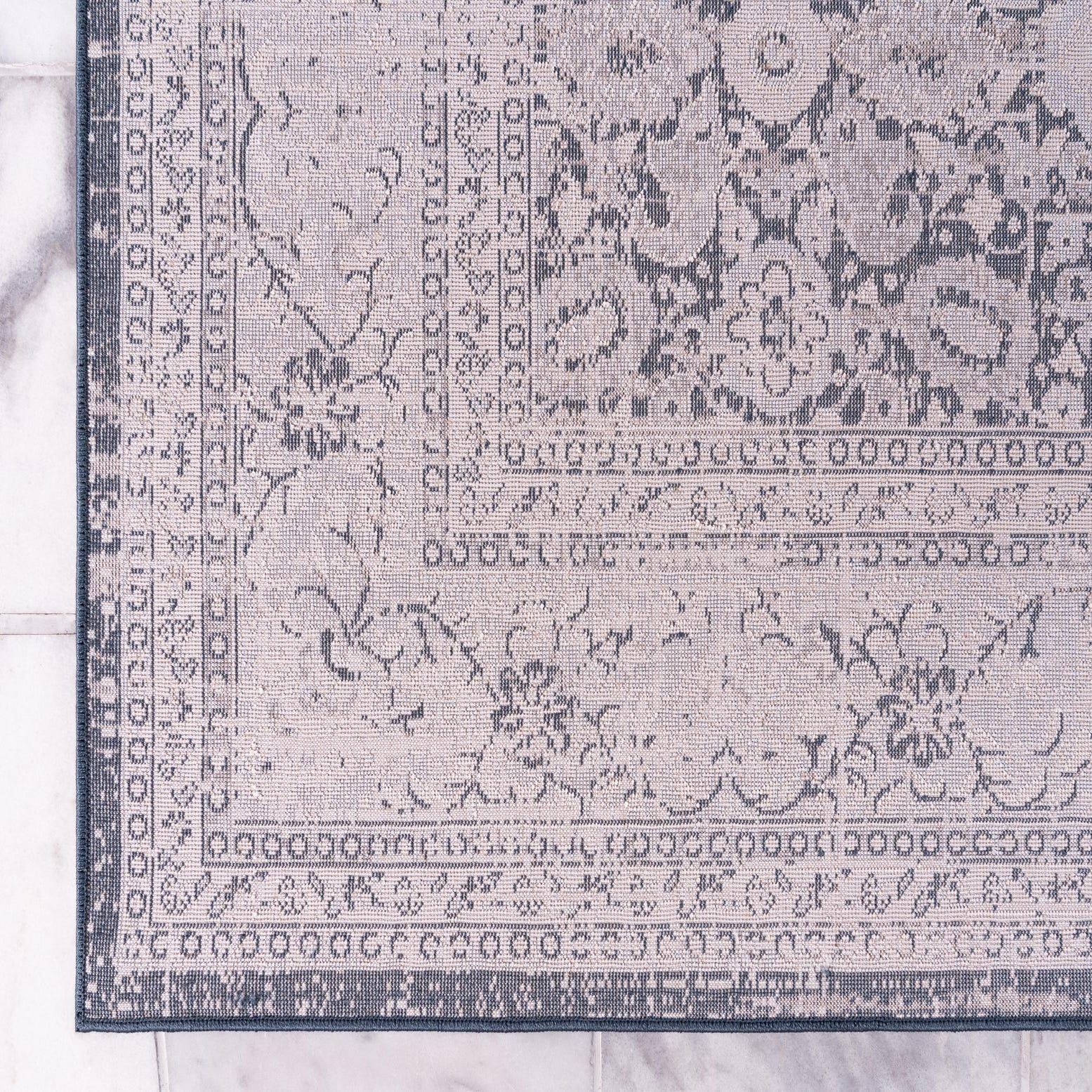 A distressed, Persian-inspired pattern unfolds across a deep dark blue ground, where compact medallions and floral motifs in ivory, beige and gray create a layered, vintage look. A soft ivory-beige border frames the central field, adding definition while the worn, low-contrast distressing gives the design a lived-in character that stays quiet rather than loud.