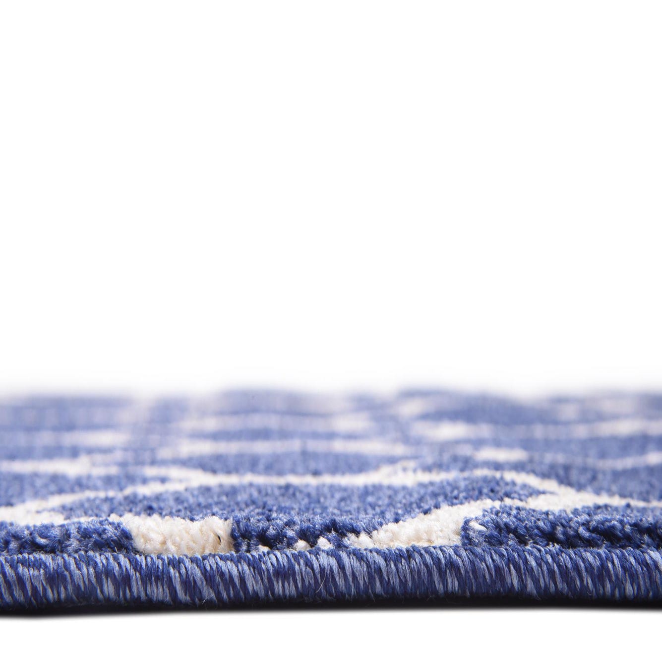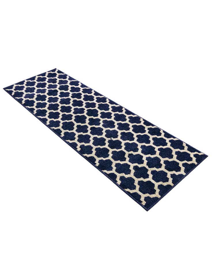 A classic Moroccan-inspired lattice pattern runs the length of this runner, with ivory quatrefoil outlines set against a dark blue ground and subtle navy blue shading that gives the motif depth. Machine-made from 100% polypropylene, the rug’s dense pile has a soft hand and a slight low-profile plushness that feels comfortable underfoot while keeping the pattern crisp and defined.