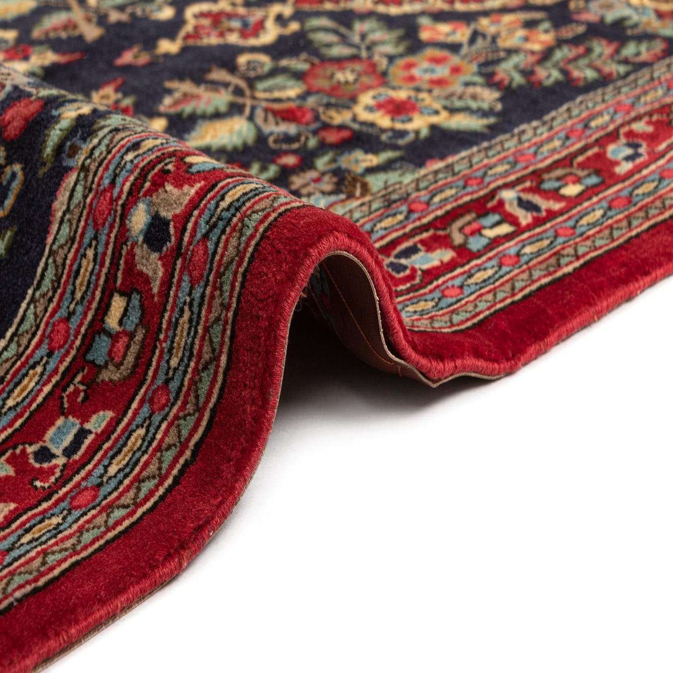 The Ghom collection presents a meticulously handcrafted wool runner, measuring 6 feet in length. This particular piece features a dark blue background, which serves as a rich canvas for the detailed patterns that adorn it. The design showcases a classic oriental pattern with symmetrical floral motifs that create a sense of harmony and elegance. Intricate borders frame the central field, featuring a complementary color palette that includes bold reds, deep blues, and accentuating touches of gold, ivory, and green.
