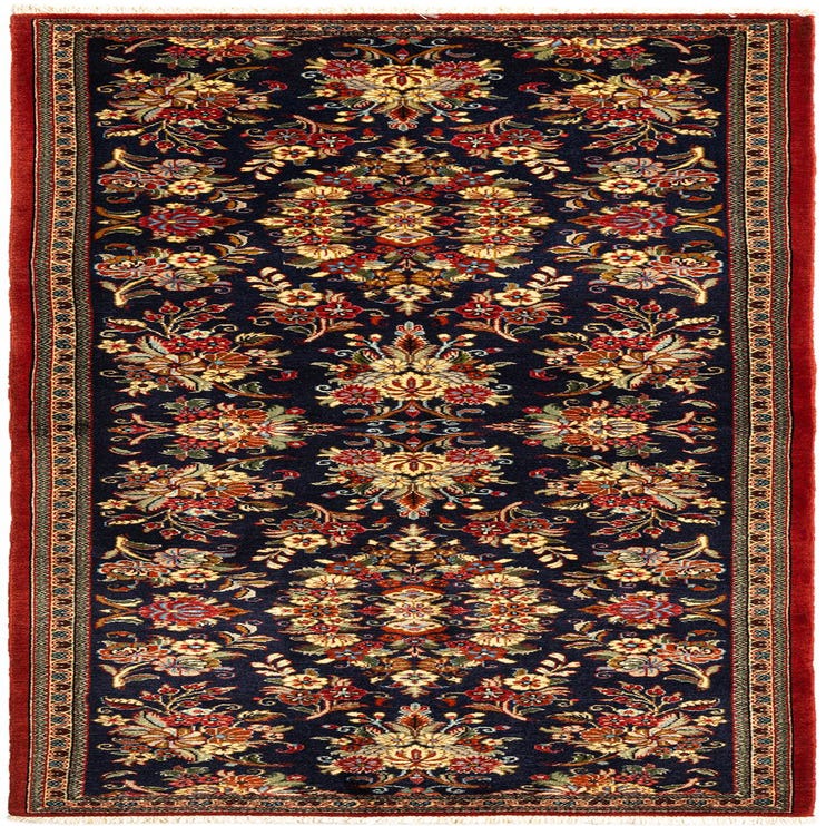 The Ghom collection presents a hand-made wool runner, measuring 6 feet in length. This piece features an intricate pattern characterized by symmetrical floral motifs, creating an elegant and timeless design. A rich dark blue background anchors the assortment of accent colors, which include shades of red, gold, cream, and hints of green.