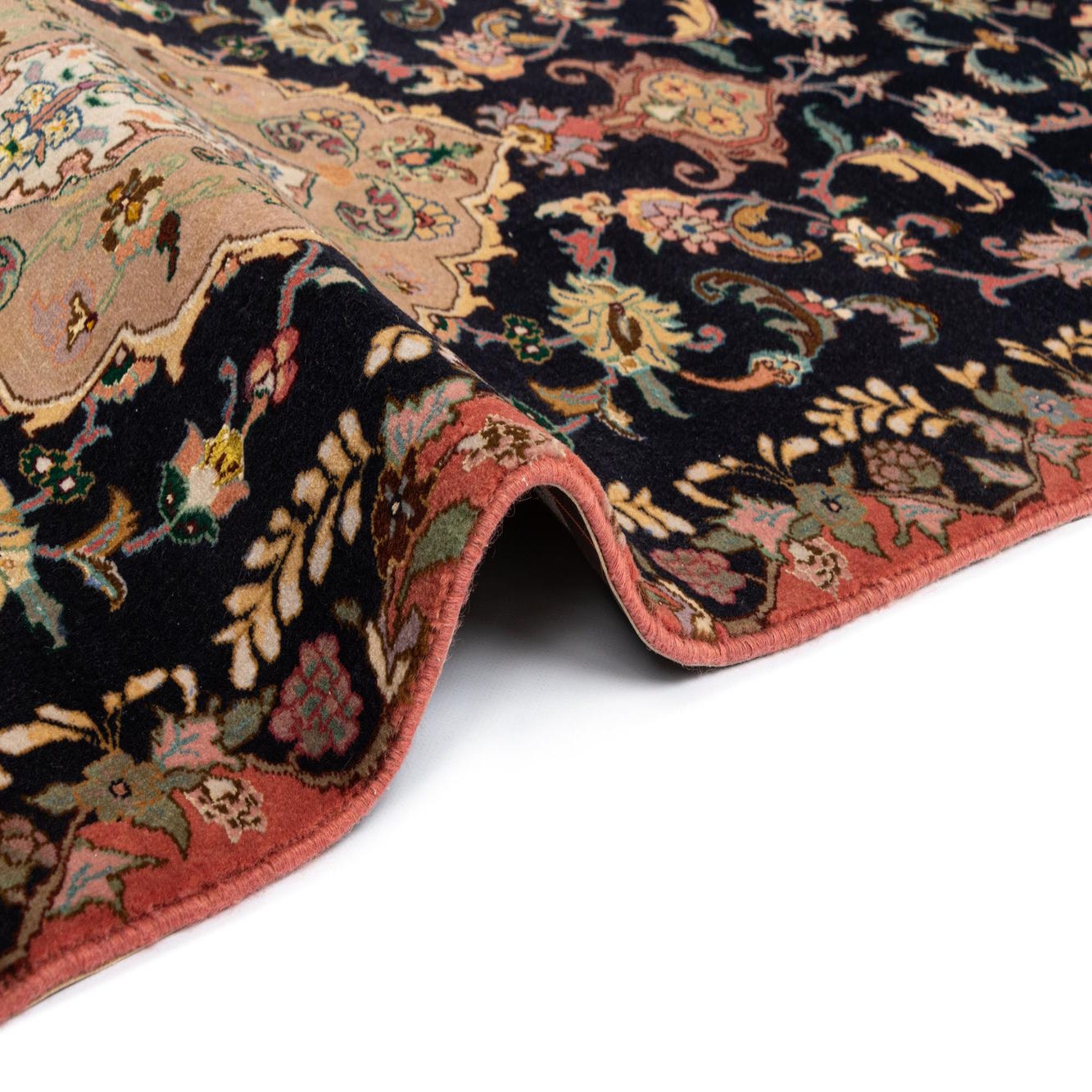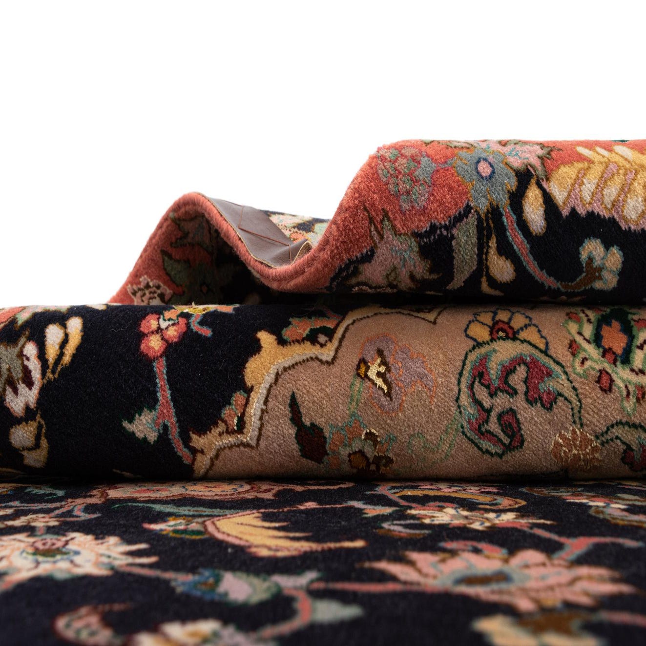 This Tabriz collection rug, meticulously handcrafted from a blend of wool and silk, presents a sophisticated design that contributes to its timeless appeal. Measuring 6 feet in length, this runner features a rich dark blue background that sets the stage for an intricate pattern of florals and ornate motifs. The palette incorporates complementary shades of brown, pink, yellow, and green, resulting in a visually harmonious composition.