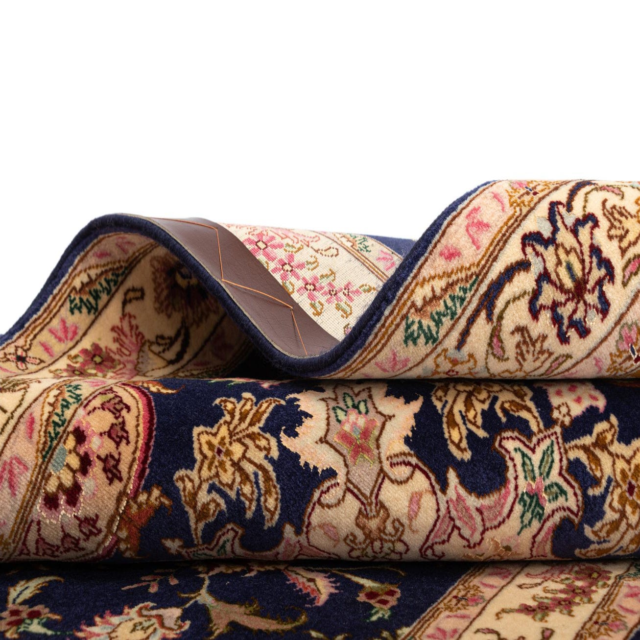 The Tabriz Collection presents a 6 Ft Runner, a handcrafted piece that harmoniously blends wool and silk to create a visually stunning and tactile accessory for the home. Distinguished by its dark blue background, the rug showcases an intricate pattern of floral motifs and intricate detailing in a palette that includes beige, pink, brown, olive, red, and purple accents. The pattern is symmetrical and displays a traditional influence with its ornate border that frames the central composition, adding a layer of sophistication and depth.