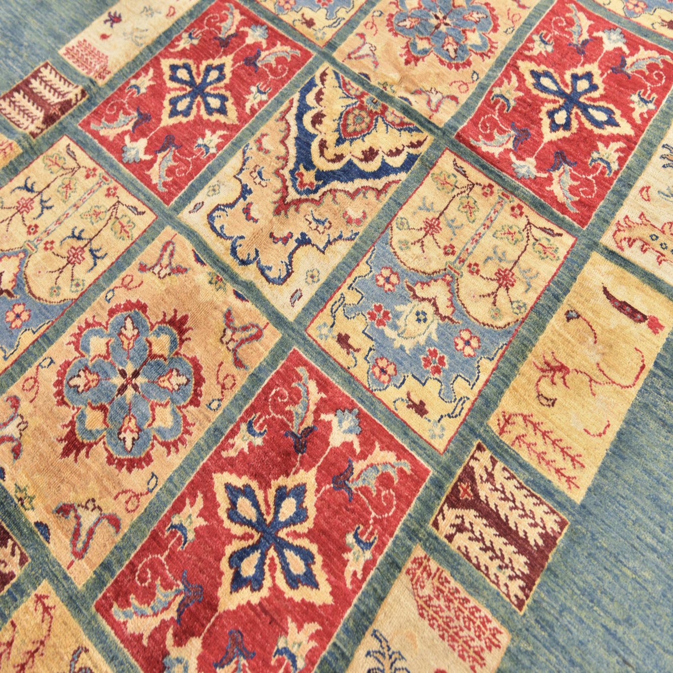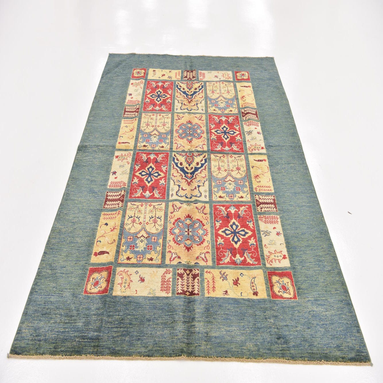 A 6x9 rectangular Ariana Ziegler rug featuring a teal border and a central pattern of red, blue, and gold floral and geometric squares.