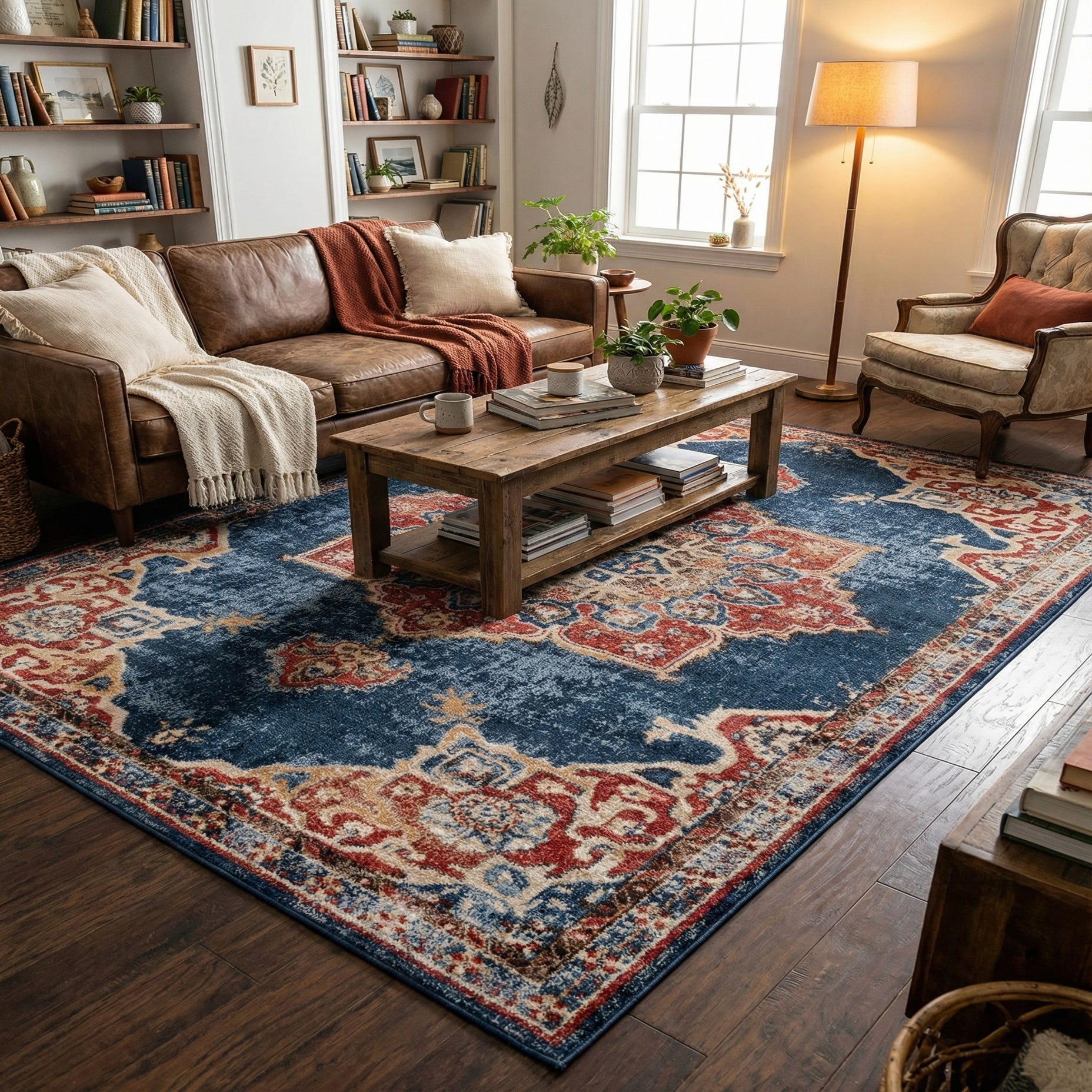 This piece works well as the focal rug in a living room beneath a coffee table, as an anchoring layer in a bedroom, or under a dining table to bring warmth and color to the space. Pair it with warm wood furniture, brass or gold accents, and neutral upholstery for a traditional-to-transitional look, or combine it with navy or cream sofas and light-blue textiles to soften the palette. The rug’s balanced colors and pattern make it easy to layer with both antique and modern furnishings for a pulled-together room.