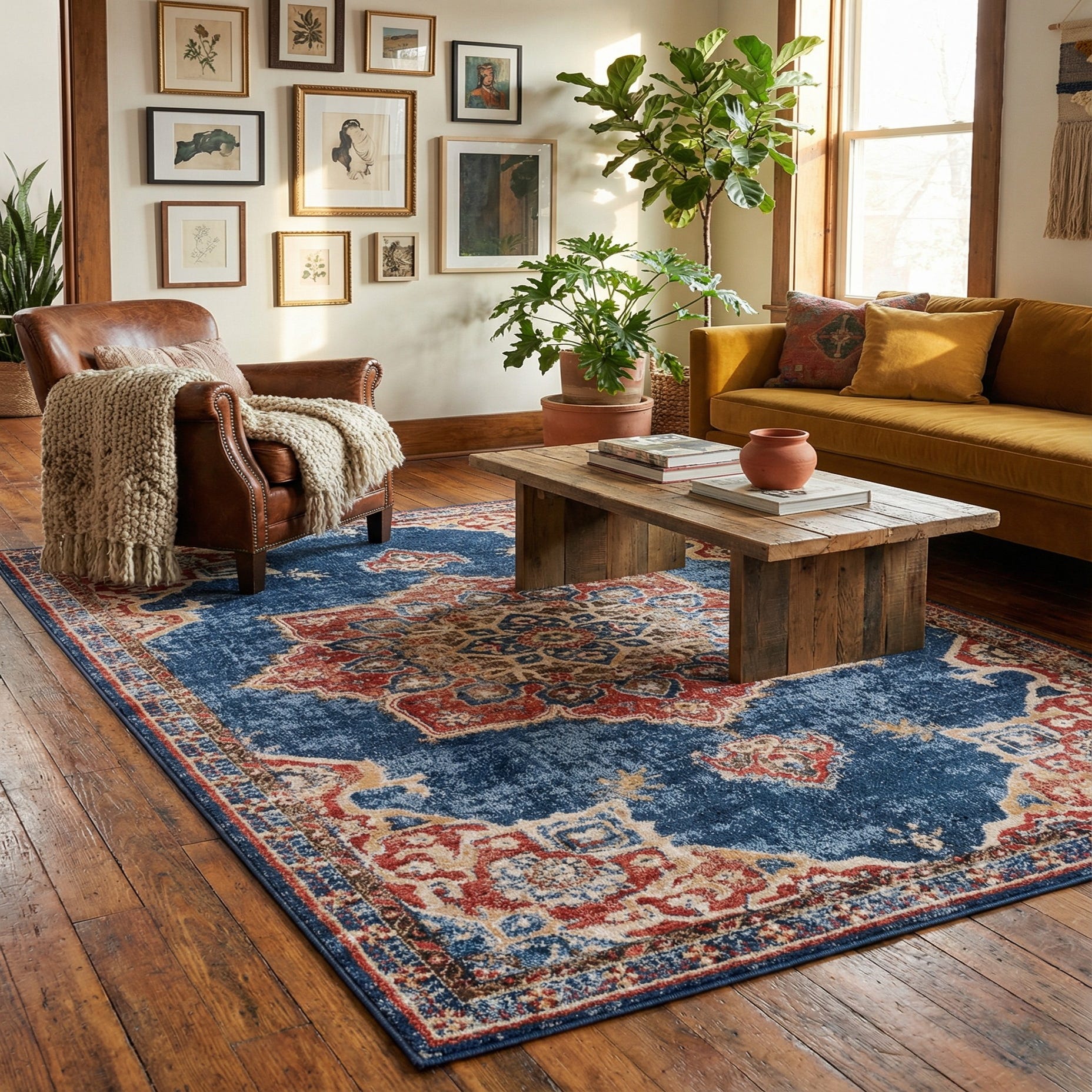 A deep dark blue field anchors a traditional medallion design, where a richly detailed central motif unfolds in rust red, orange and gold tones framed by cream, beige and light blue highlights. The pattern carries an intentionally distressed look that softens the edges and adds visual texture, while the borders echo the medallion’s colors and bring a layered, classic feel. Machine-made from 100% polypropylene, the rug has a low, dense pile that feels smooth and slightly plush underfoot with a subtle sheen from the yarns.