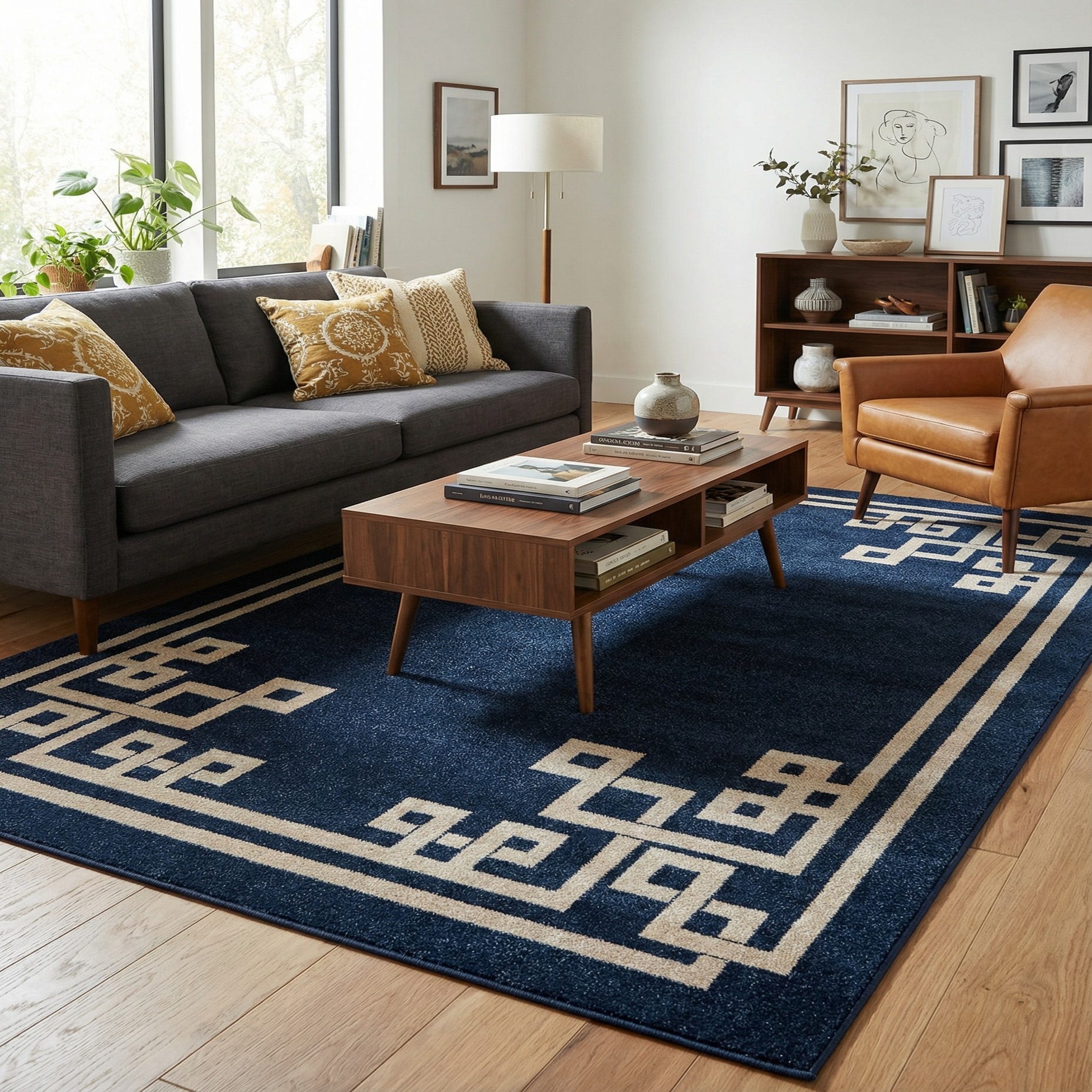 A deep dark blue field sets a calm, grounded backdrop for a crisp beige geometric border. The design pairs a double-line frame with angular, square-spiral corner motifs that nod to a classic Greek-key influence while keeping a modern, graphic feel. Machine-made from 100% polypropylene, the low-cut pile feels smooth and slightly velvety underfoot and presents the pattern with clear, sharp edges.