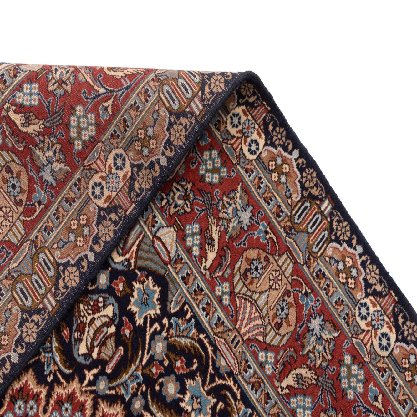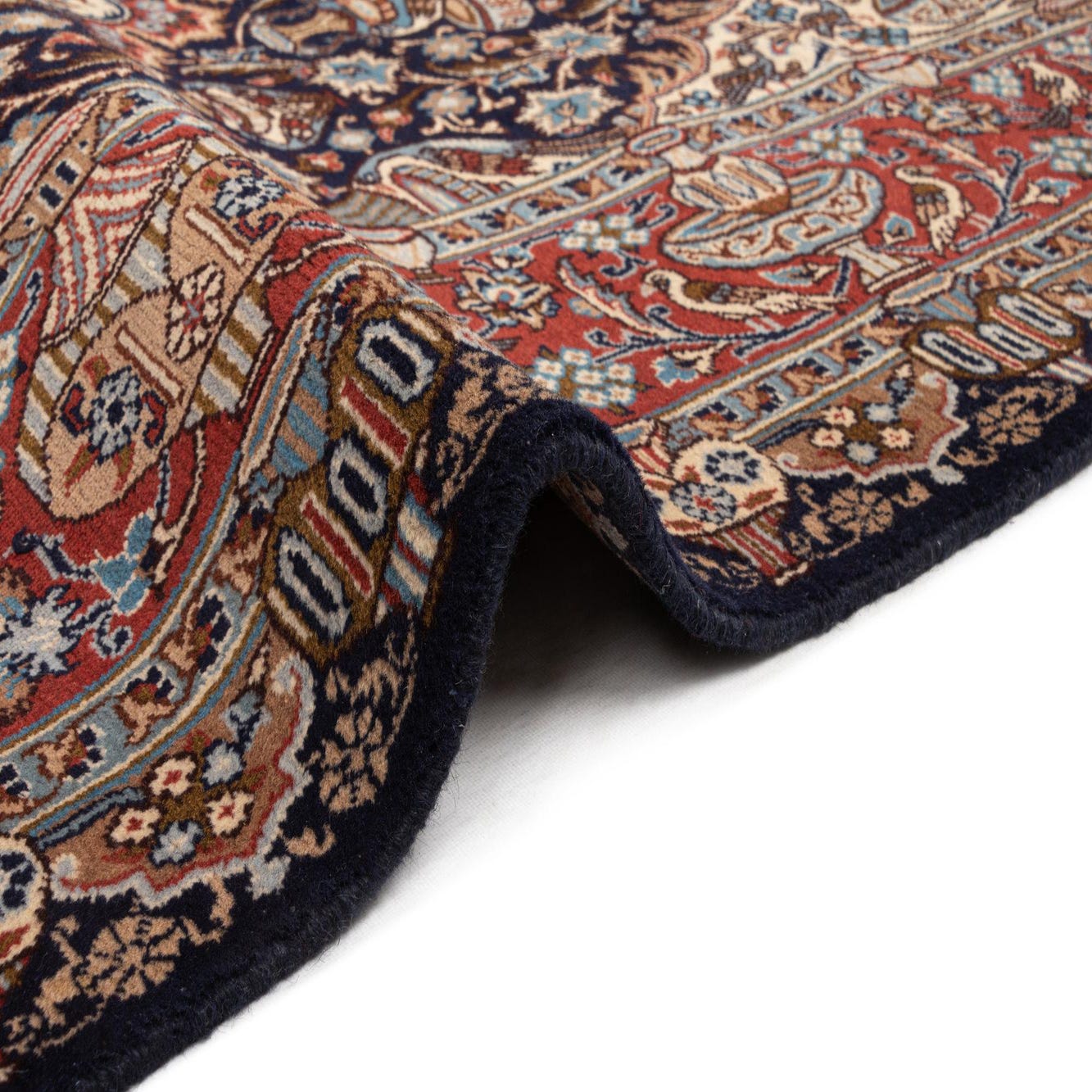 A 6x9 rectangular Kashmar Persian rug featuring a complex floral medallion in blues, reds, and creams on a dark blue field, with an ornate red border.