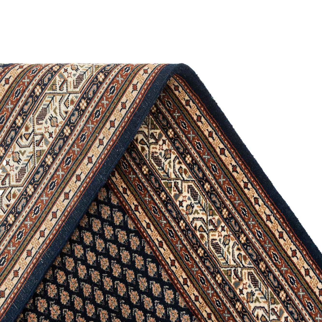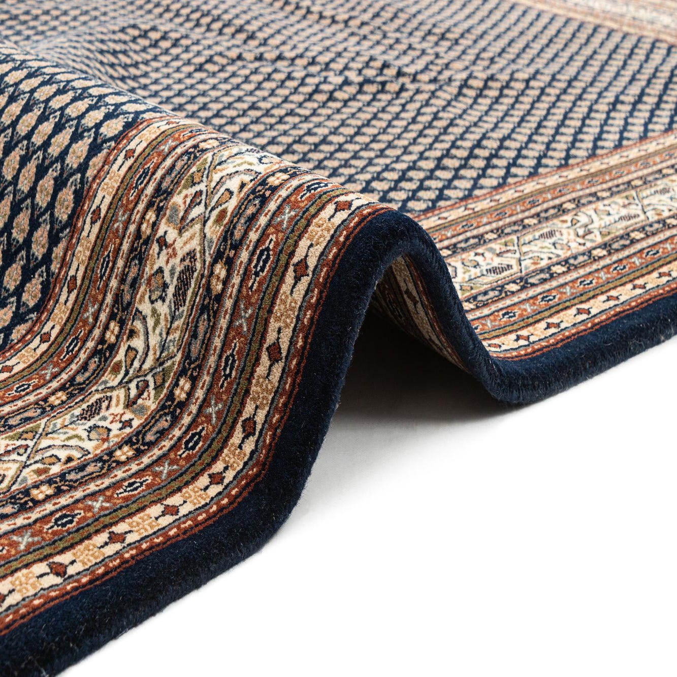 A 6x9 rectangular wool area rug featuring a dark blue field with repeating small gold and brown motifs, framed by a multi-layered border in cream, brown, and gold patterns, suitable for a living room.