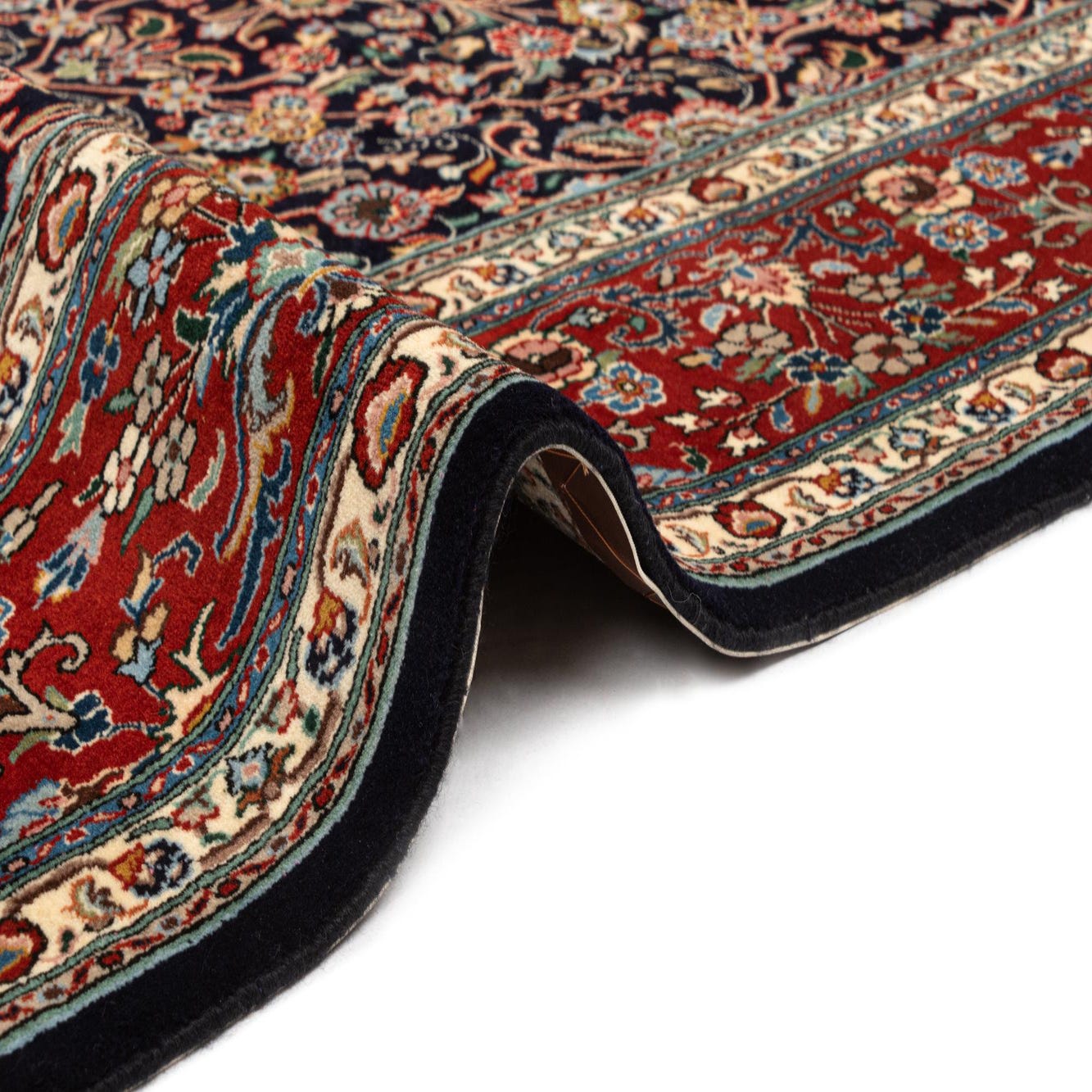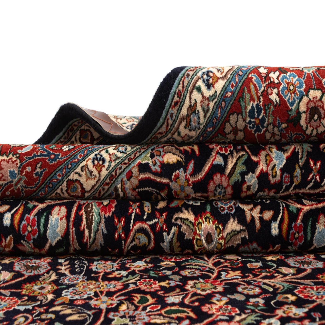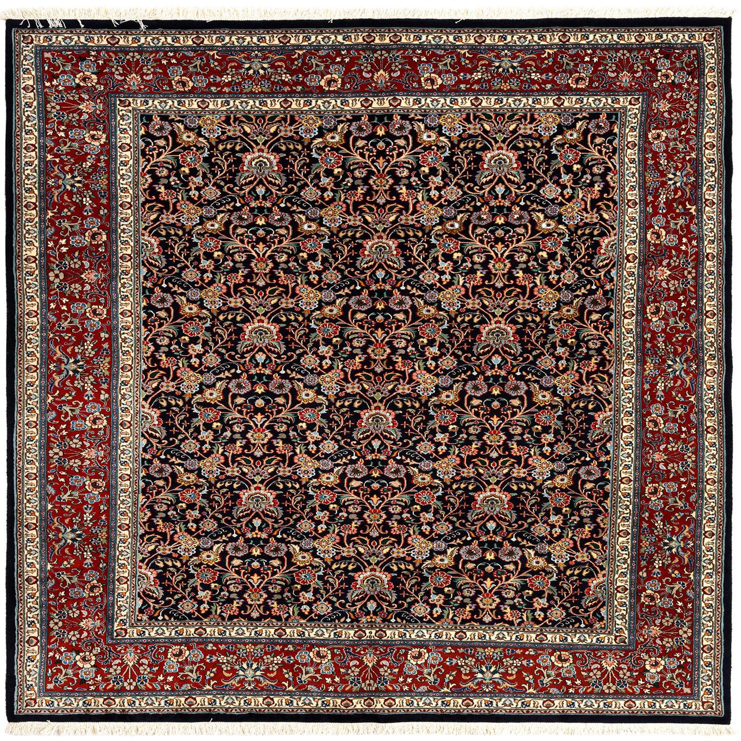 A 6x9 rectangular Persian rug with a dark blue field and intricate floral patterns, framed by a rich red border.