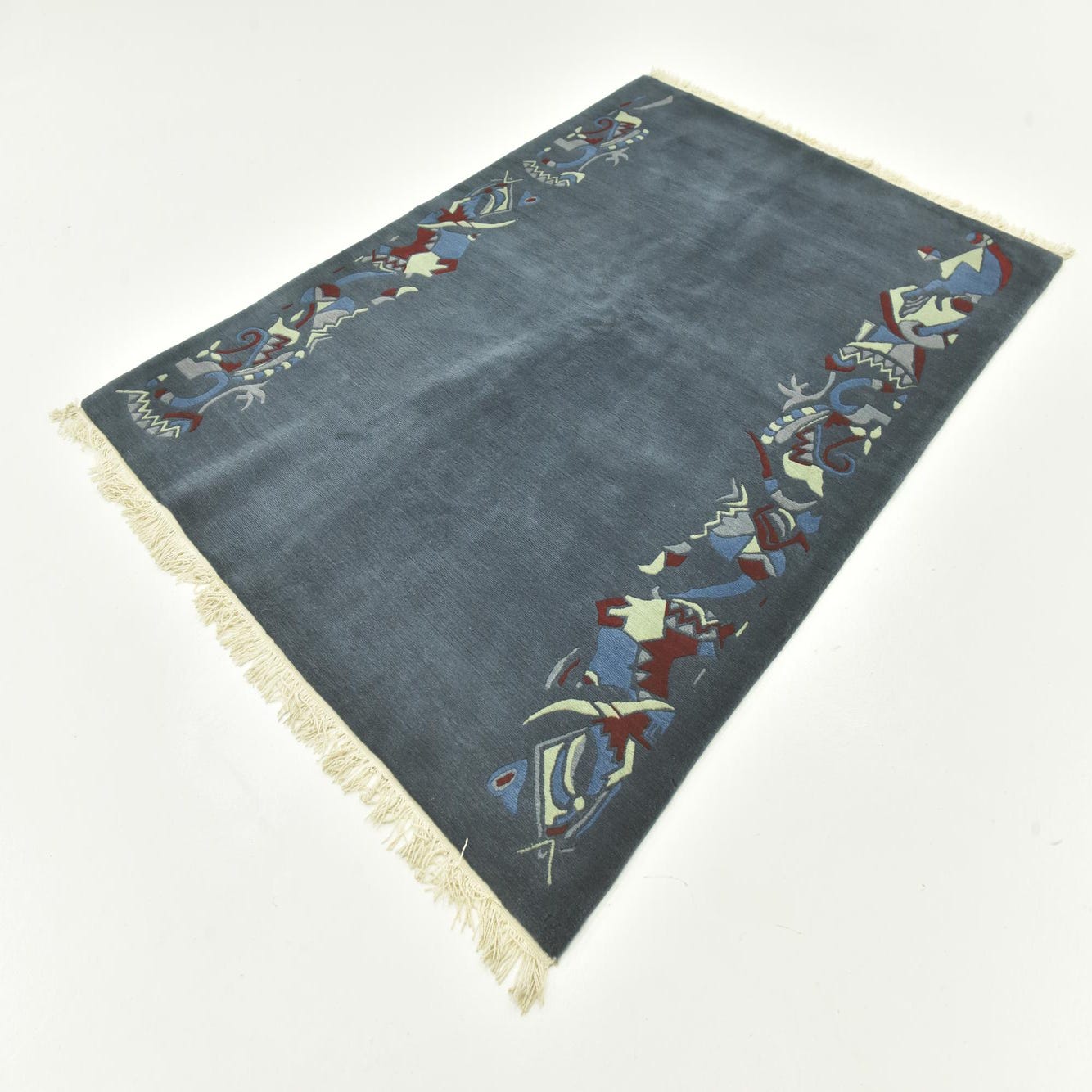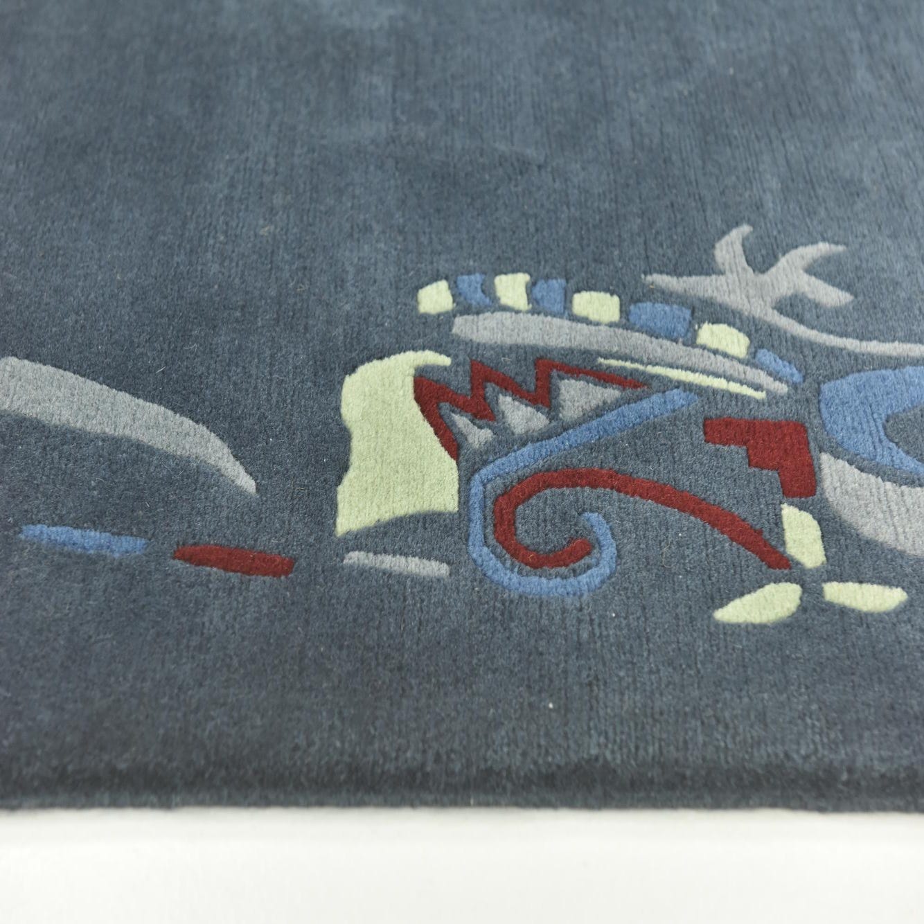 A 6x9 rectangular blue wool rug with a modern abstract border in shades of blue, red, and cream, featuring a high pile.