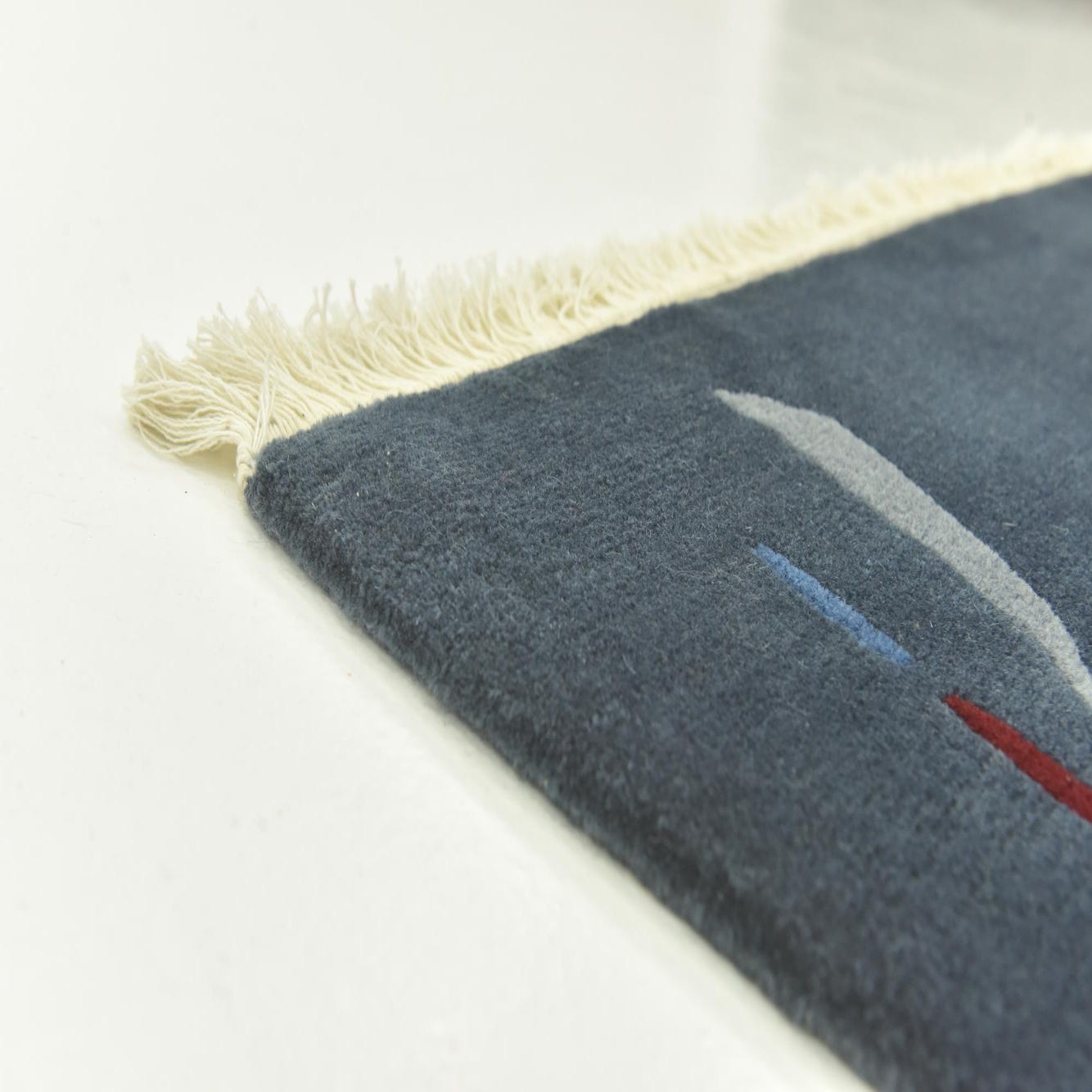 Primary color is Dark Blue. Colors in this rug include: Dark Blue, Blue, Gray, Light Green, Red.