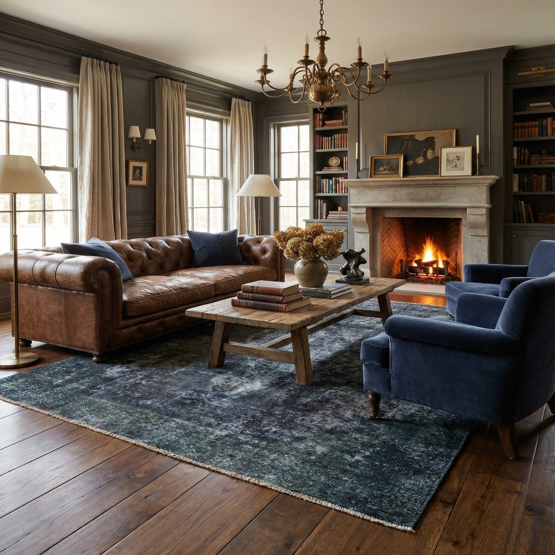 A 6x9 rectangular blue wool rug with a distressed Persian vintage pattern, ideal for a living room.
