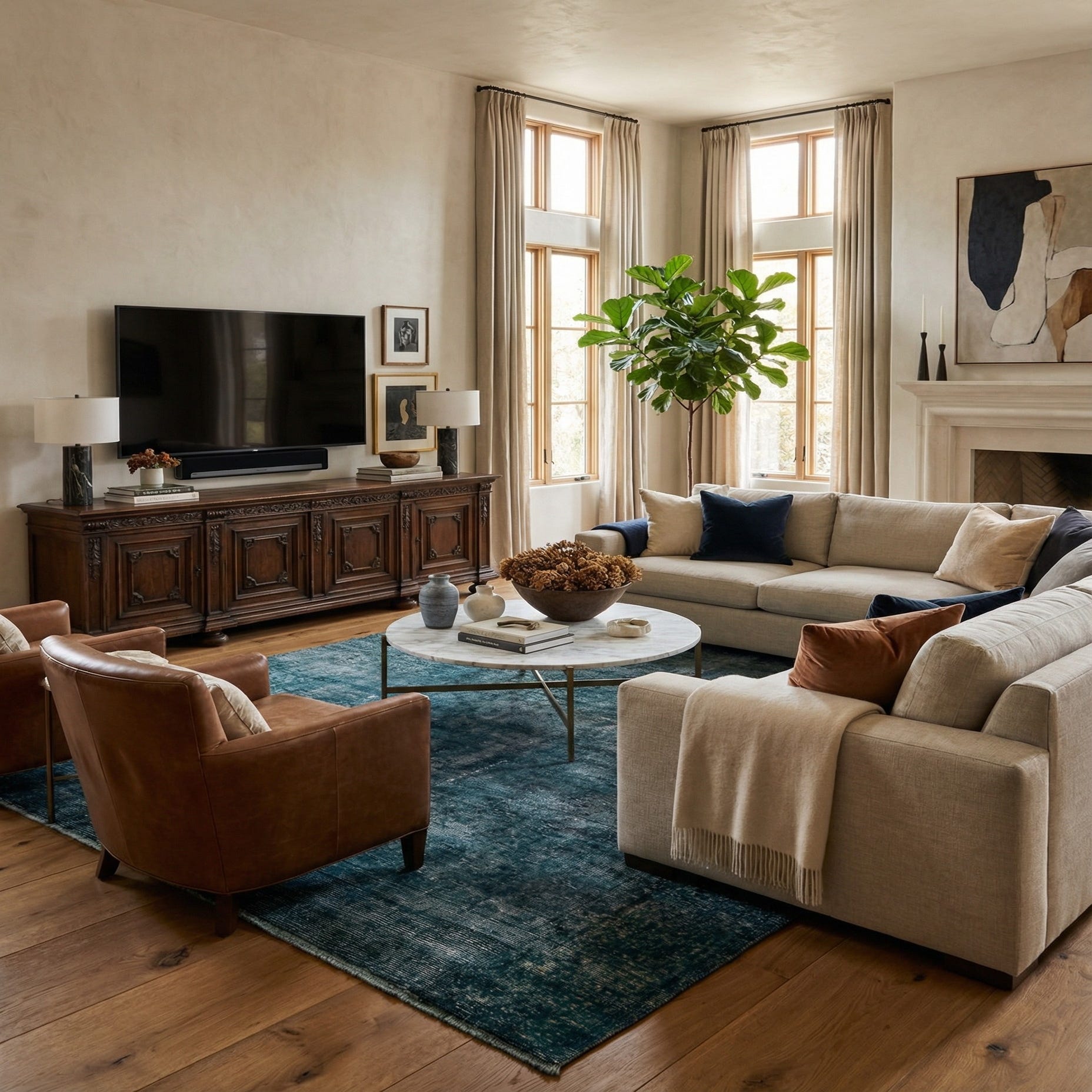 Given its versatile color scheme and enduring pattern, this piece can seamlessly integrate into various decor settings. It would complement interiors that lean towards a classic aesthetic, or it could lend an eclectic touch to a modern minimalist space. It might also serve as an understated yet characterful base for a more bohemian-style room. The dark hues make it suitable for high-traffic areas, as they can gracefully conceal the rigors of daily use.