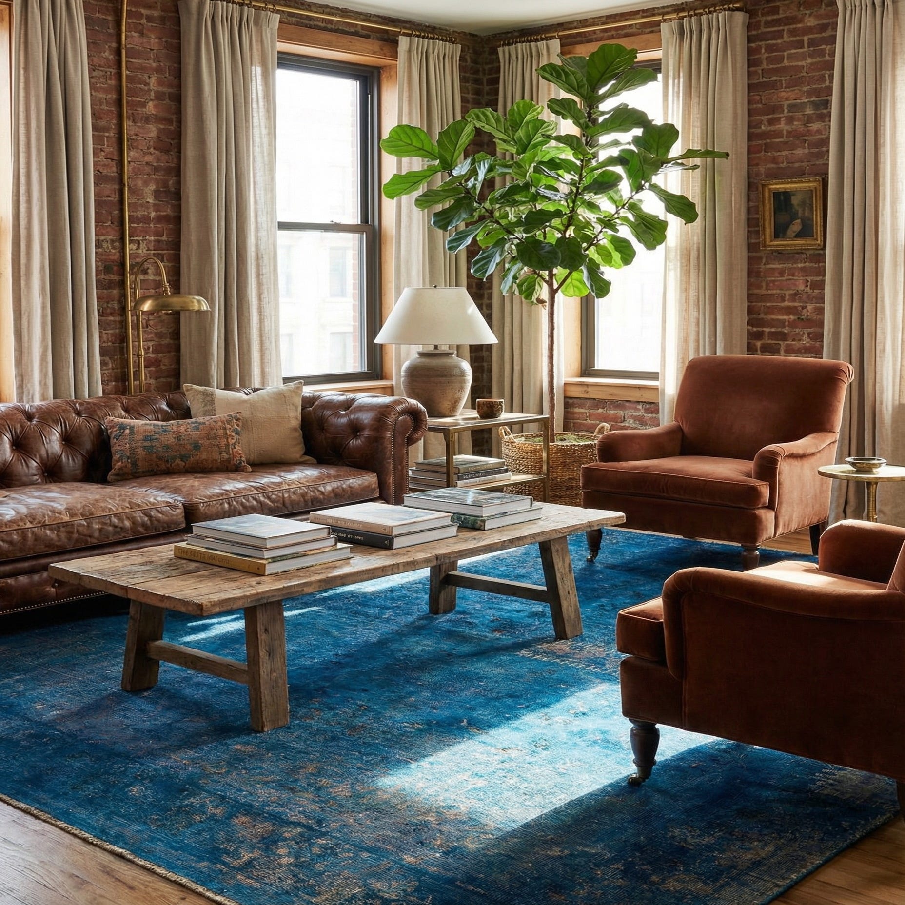 A 6x9 rectangular blue Persian-style rug with a distressed, vintage look and subtle medallion pattern.