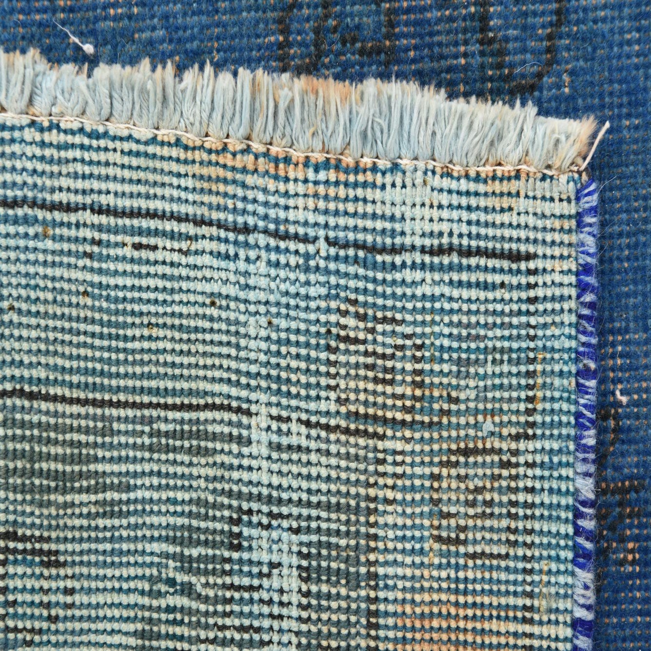 This Ultra Vintage collection rug, measuring 6x9, features a deep, dark blue background with subtle black detailing, creating a dynamic yet understated look. The hand-knotted 100% wool construction ensures a dense and plush texture, providing both durability and comfort underfoot. The rug boasts a distressed pattern that hints at traditional motifs, offering a sense of history and timelessness.