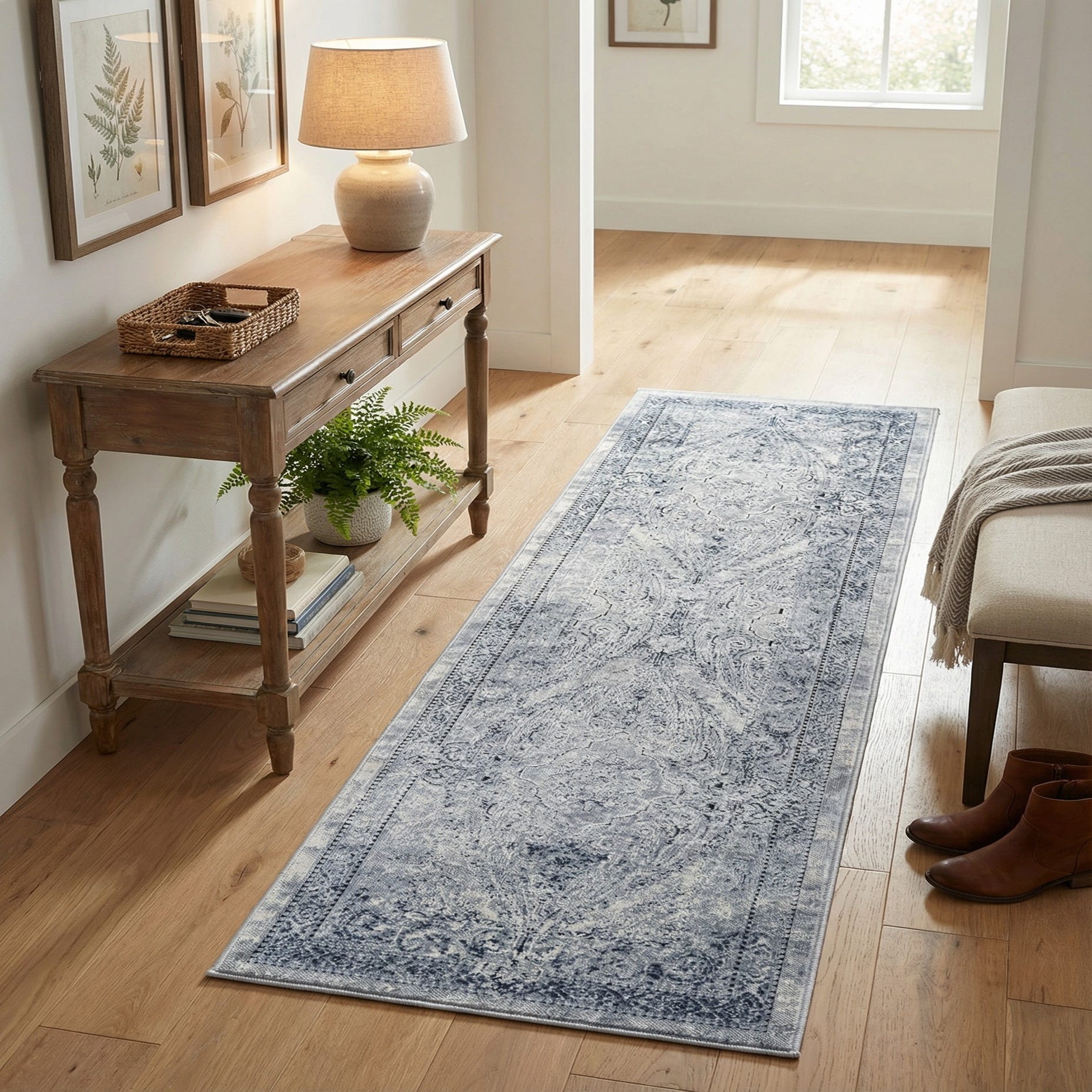 Machine-made from 85% polypropylene and 15% chenille, the runner has a low-profile pile with a soft chenille hand and a subtle sheen. The construction produces an even, slightly textured surface that feels comfortable underfoot, making it well suited for hallways, entryways, or placed alongside a bed. Pair it with light wood floors and crisp white trim for contrast, or layer it over a larger neutral area rug in a transitional living room; it also complements coastal and modern-traditional schemes where a touch of classic pattern is desired.