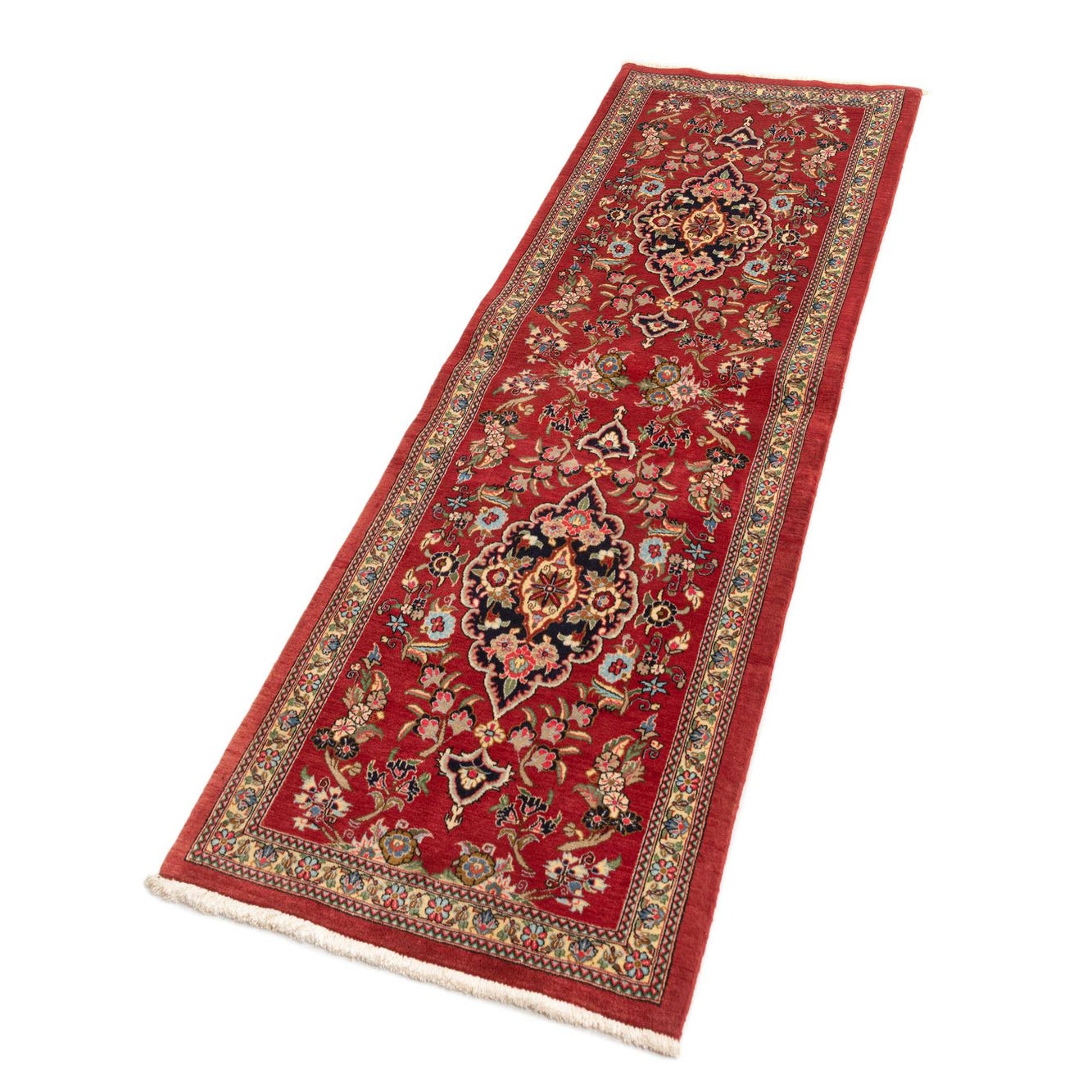A 7 ft Qom runner rug with a traditional Persian pattern in rich blues and reds, perfect for a hallway.
