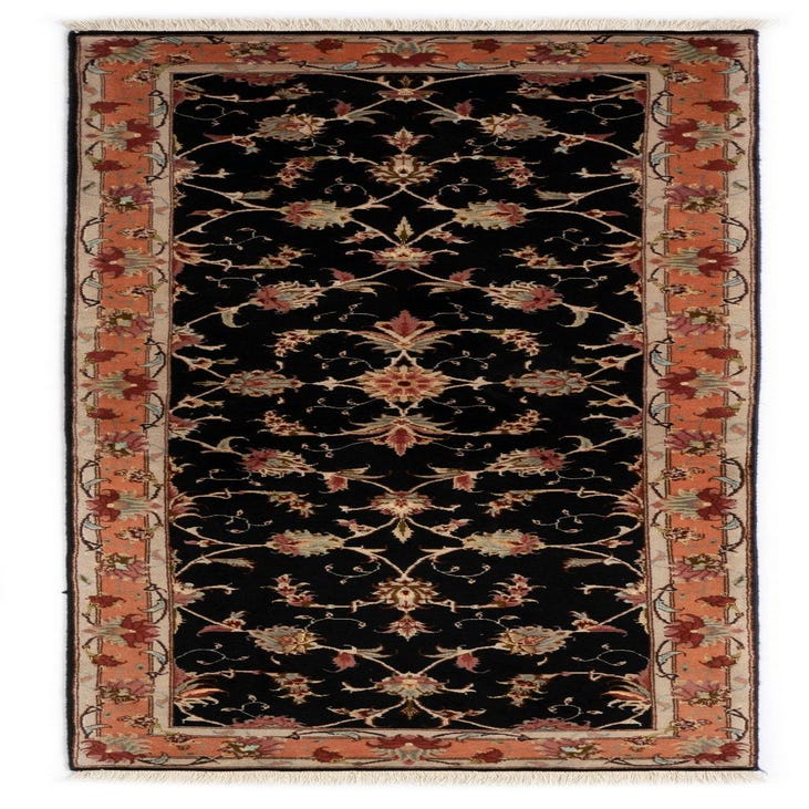 A 7 ft runner rug in a Persian style, featuring a deep black field with intricate floral motifs in blues, creams, and reds, bordered by a complementary peach and cream design.