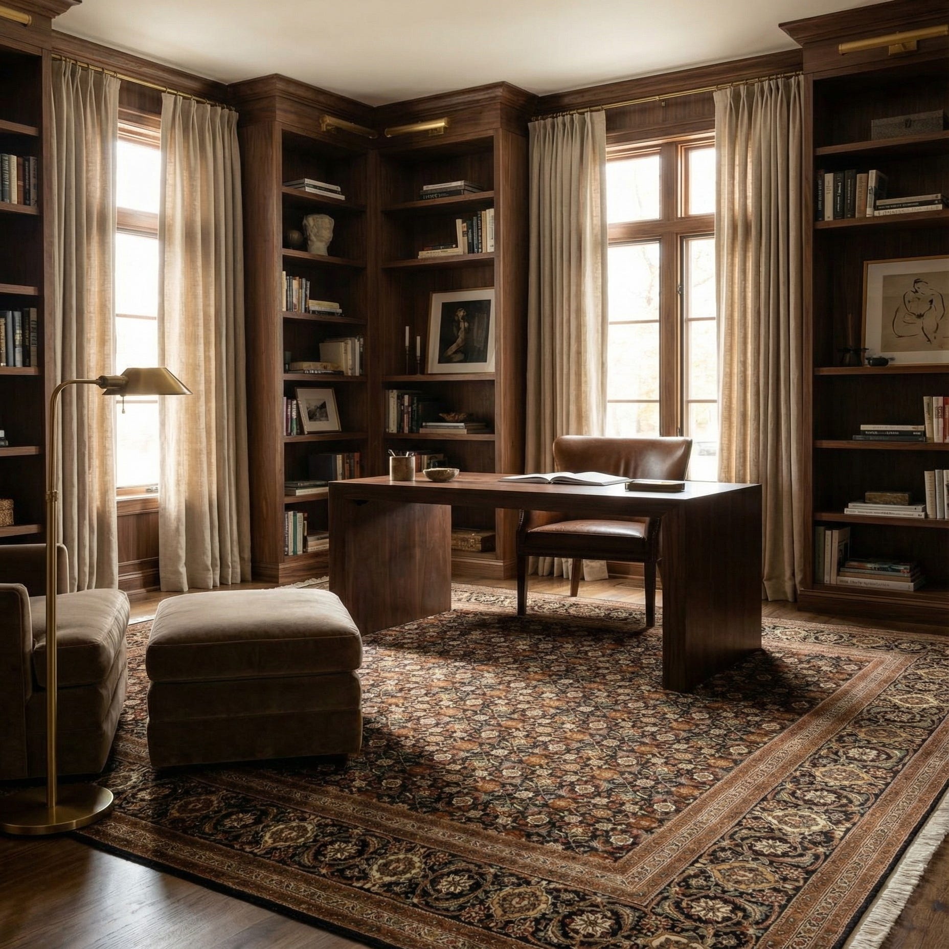 Ideal for a range of interior design scenarios, this rug would complement traditional decor beautifully, harmonizing with rich wooden furnishings and adding warmth to a classic living room or dining area. The rug's square shape and durable construction also make it well-suited for use in a spacious foyer or under a round table in an office setting, where it can anchor the space with its elegant design.