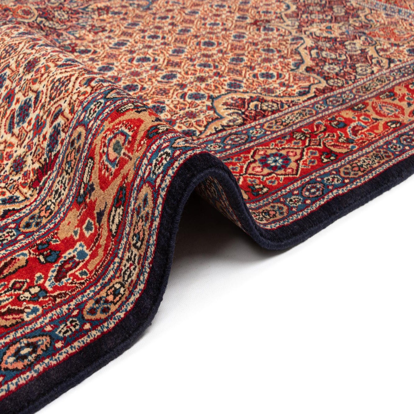 A 7x10 rectangular Mood Persian rug in shades of blue, red, and cream, featuring an intricate floral medallion pattern.