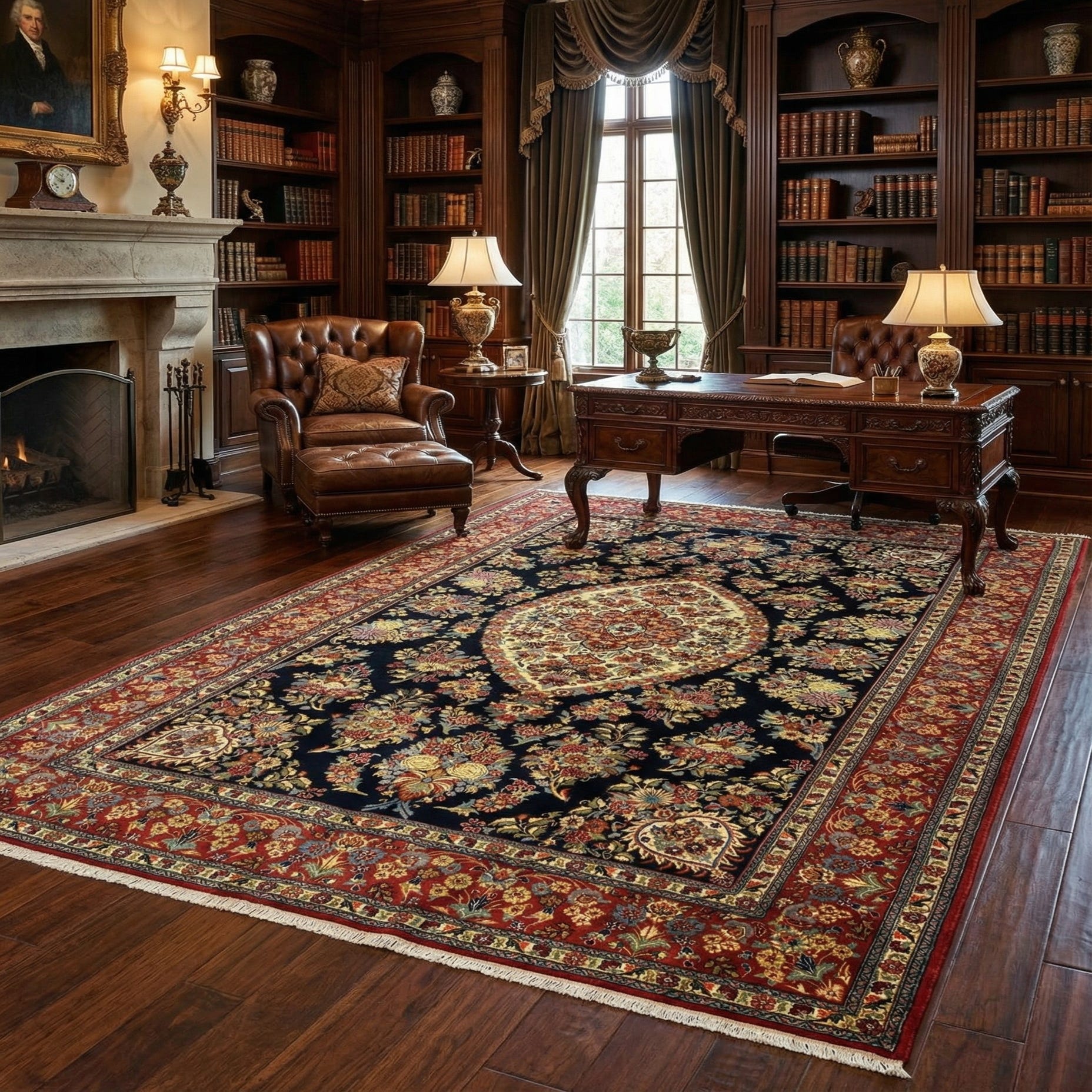 Use this rug to anchor a formal living room or dining area where traditional detailing is welcome, or bring it into a study or home library to add warmth and visual structure. It also adapts well to transitional settings—pair it with warm wood furniture, leather seating, or cream upholstery to balance the rich colors, or set it against clean-lined modern pieces for a layered, collected look.